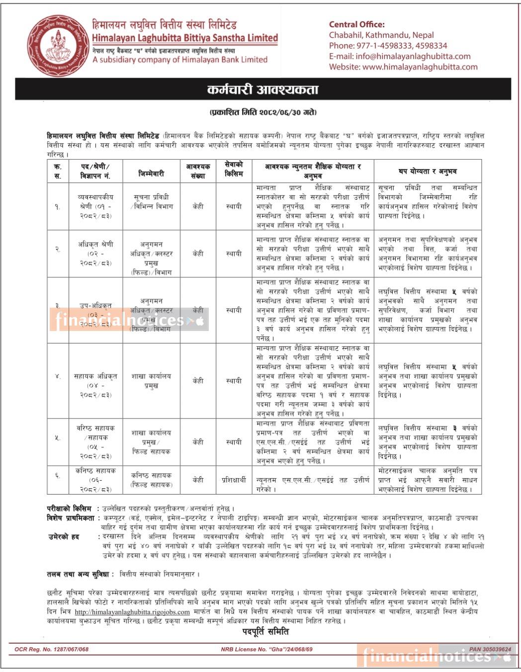 Himalayan Laghubitta Bittiya Sanstha Limited, a subsidiary company of Himalayan Bank Limited, has announced a vacancy for various positions. Qualified and interested Nepali citizens are invited to apply. The organization is a national-level microfinance institution licensed by Nepal Rastra Bank.