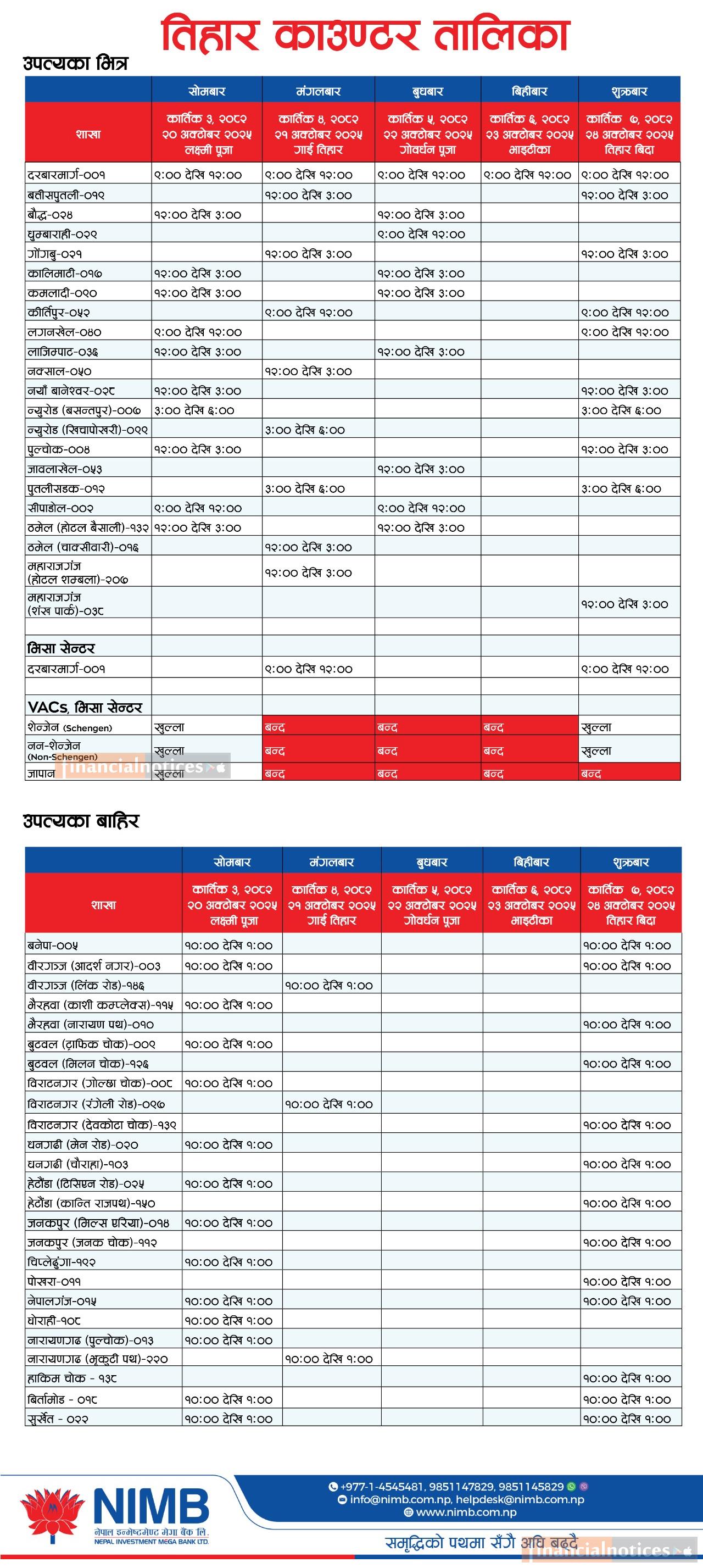 नेपाल इन्भेष्टमेण्ट मेगा बैंकको तिहारको समयमा विभिन्न शाखाहरु खुल्ला रहने सम्बन्धी सूचना