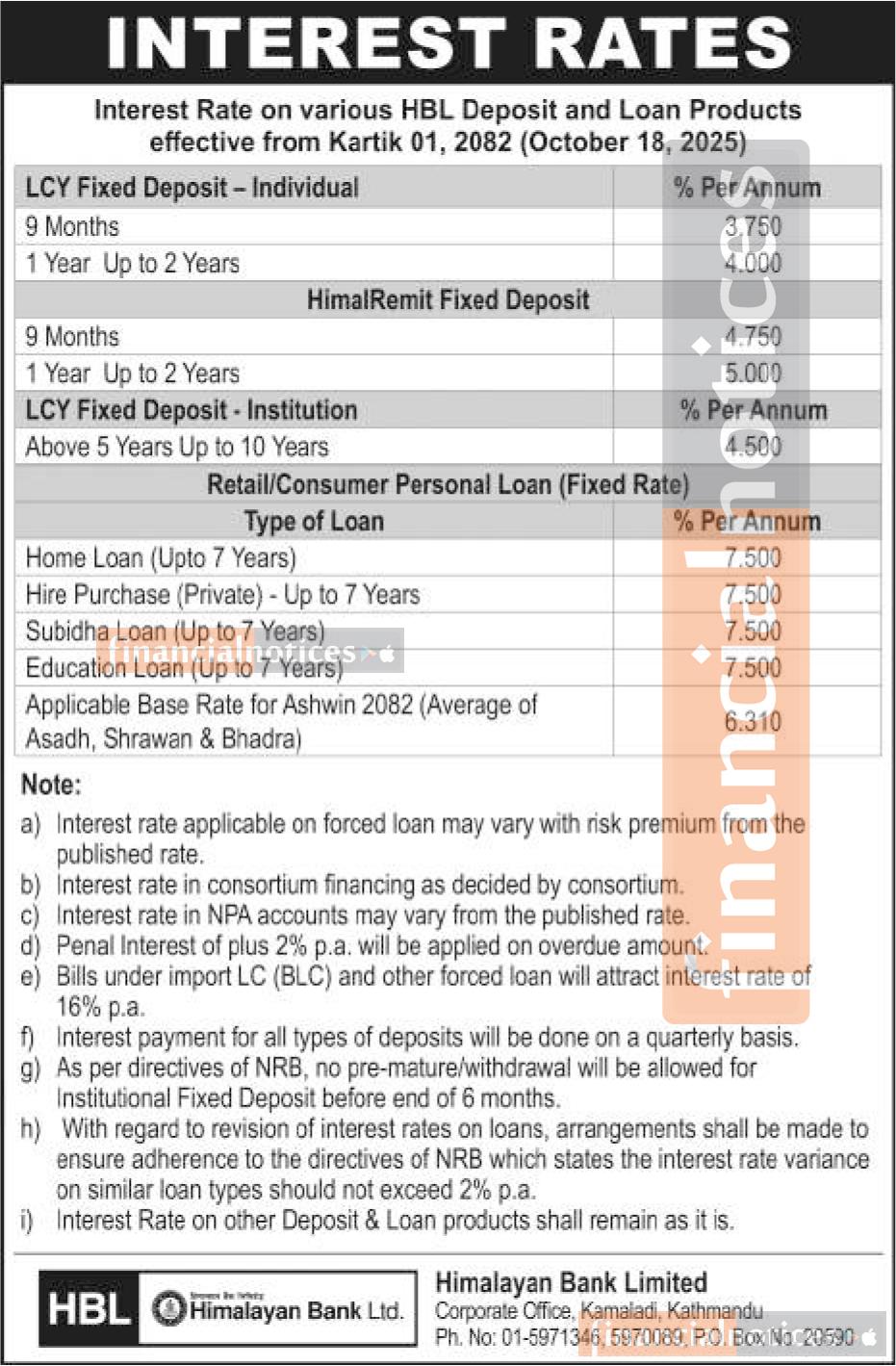 Himalayan Bank Limited has announced revised interest rates on its various deposit and loan products, effective from Kartik 1, 2082. The new rates apply to all savings, fixed deposits, and loan schemes offered by the bank.