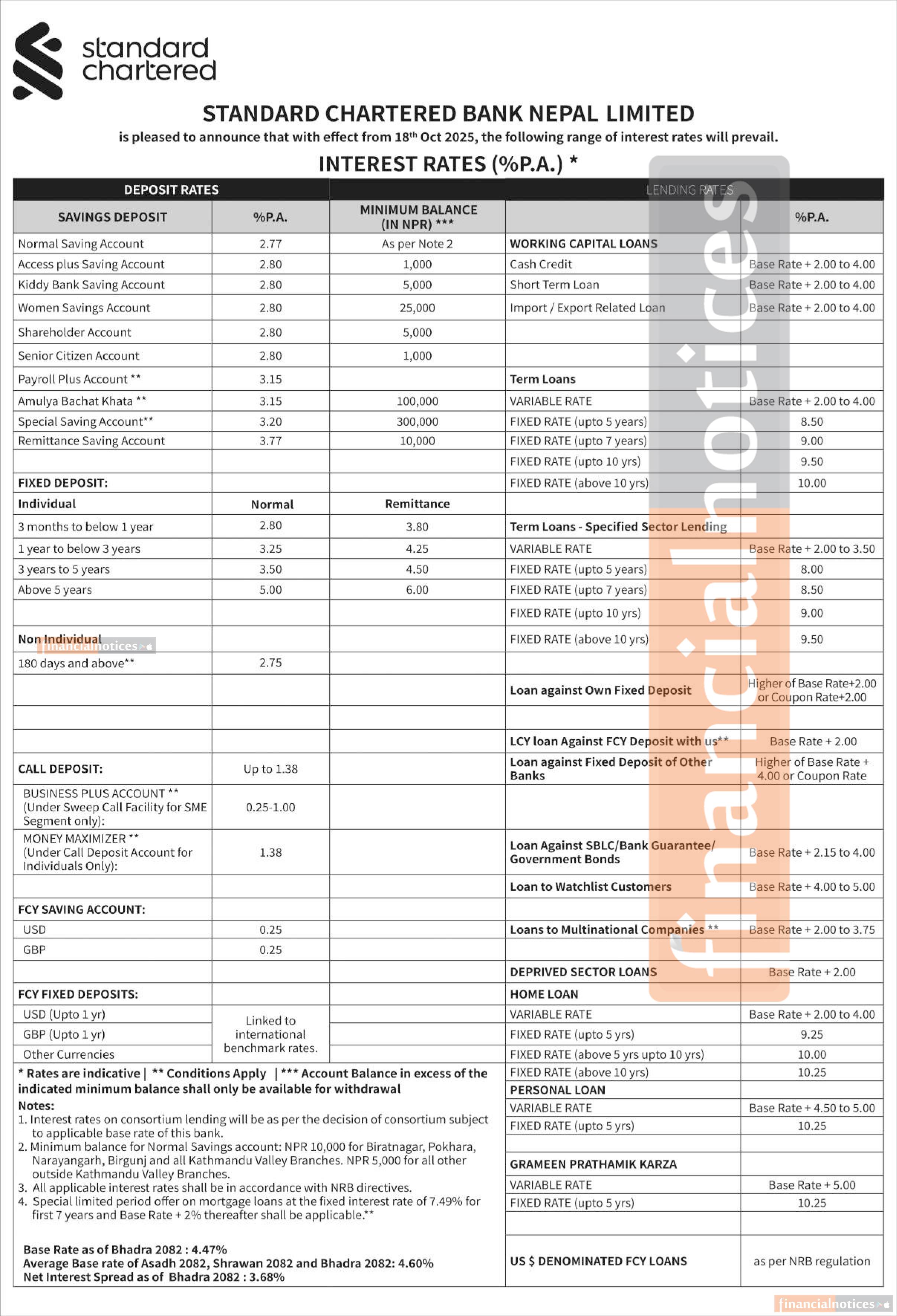Standard Chartered Bank Nepal Limited has published new interest rates applicable on various deposit and lending products, effective from 1st Kartik 2082 (18th October 2025). The revised rates will remain in effect across all its banking services.