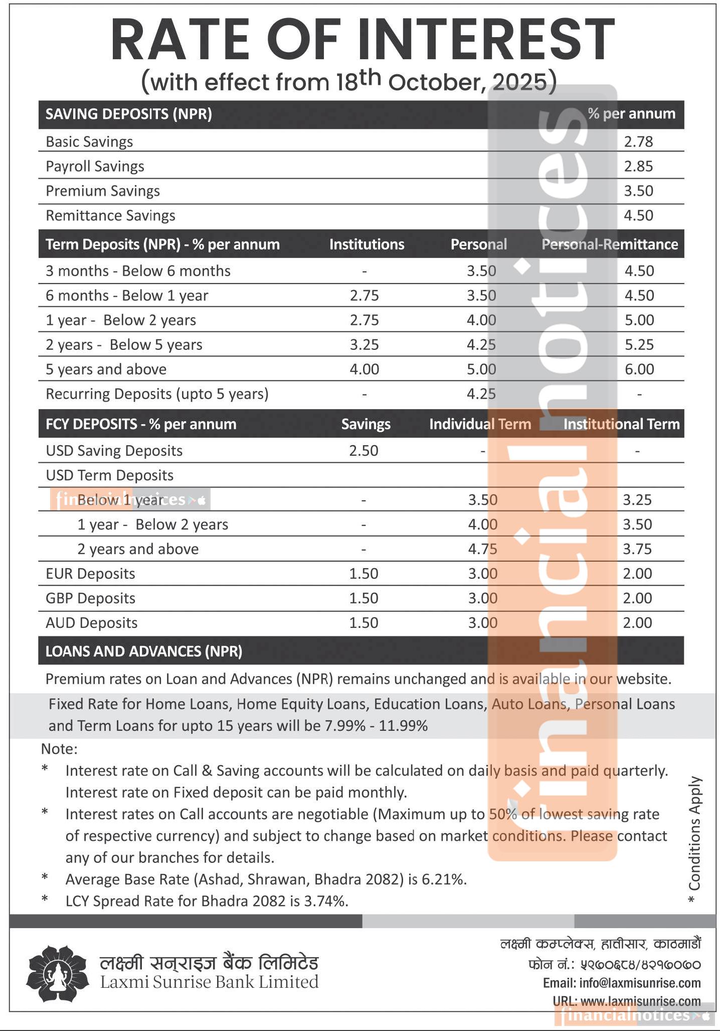 Laxmi Sunrise Bank Limited has announced new interest rates on Saving Deposits, Term Deposits, FCY Deposits, and Loans & Advances, effective from 18th October 2025 (1st Kartik 2082). The revised rates are applicable across all branches and account categories.