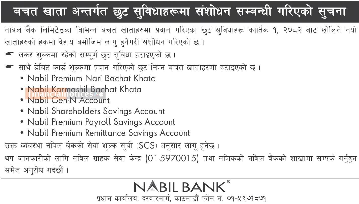 Nabil Bank has announced a revision in the discount facilities provided under various savings accounts, effective from Kartik 1, 2082. The bank has removed locker fee discounts and debit card fee waivers on select accounts, including Nabil Premium Nari Bachat Khata, Karmashil Bachat Khata, Gen-N Account, and others. The new charges will apply as per the Service Charge Schedule (SCS). For details, customers are advised to contact the nearest Nabil Bank branch or call 01-5970015.