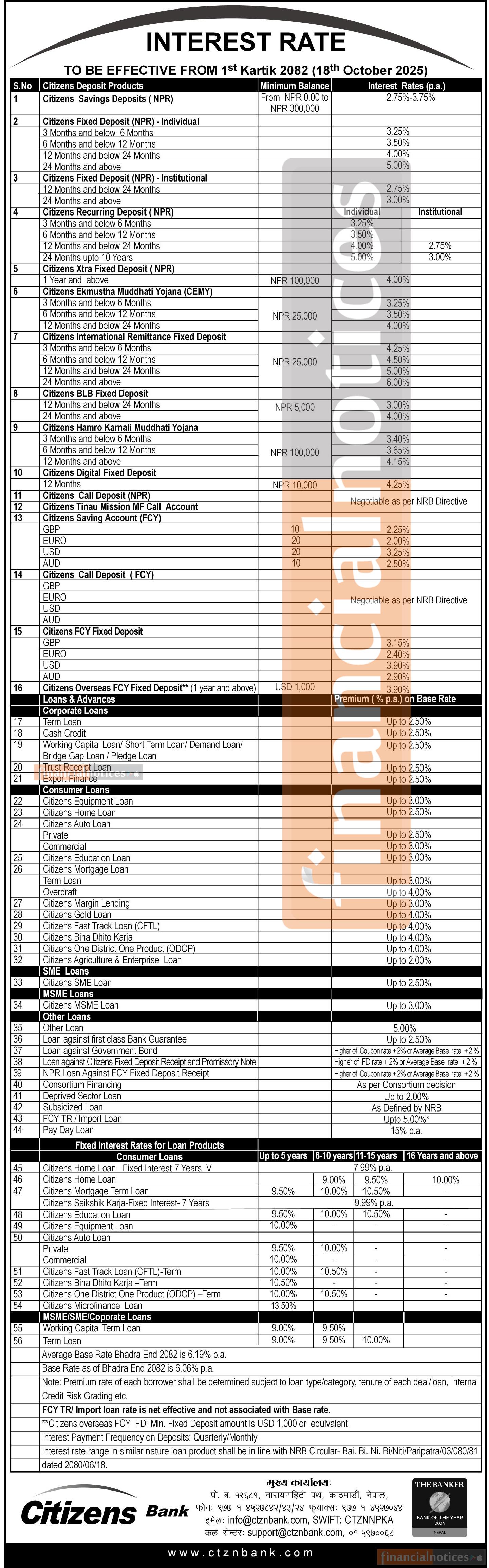 Citizens Bank International Limited has published its new interest rates, effective from 1st Kartik, 2082. The updated rates apply to various deposit and savings accounts. Customers can visit the bank’s official website or nearest branch for detailed information.