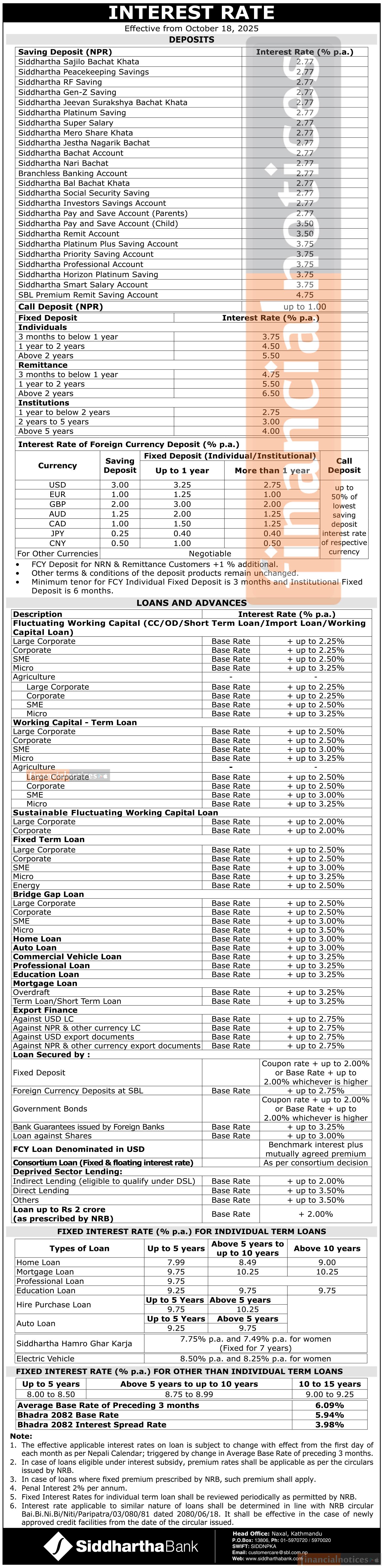 Effective from 1st Kartik, Siddhartha Bank has updated the interest rates across its savings and loan accounts. Customers can now see how the new rates impact their deposits and loans.