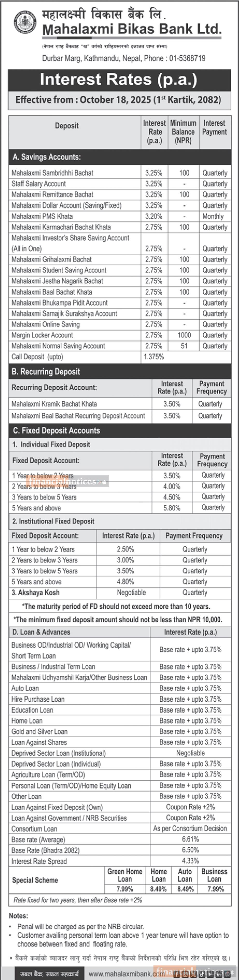 Mahalaxmi Bikas Bank Limited has announced its revised interest rates effective from 1st Kartik, 2082. The new rates apply to both savings and fixed deposit accounts. For more details, customers are encouraged to visit the bank’s official website or their nearest branch.