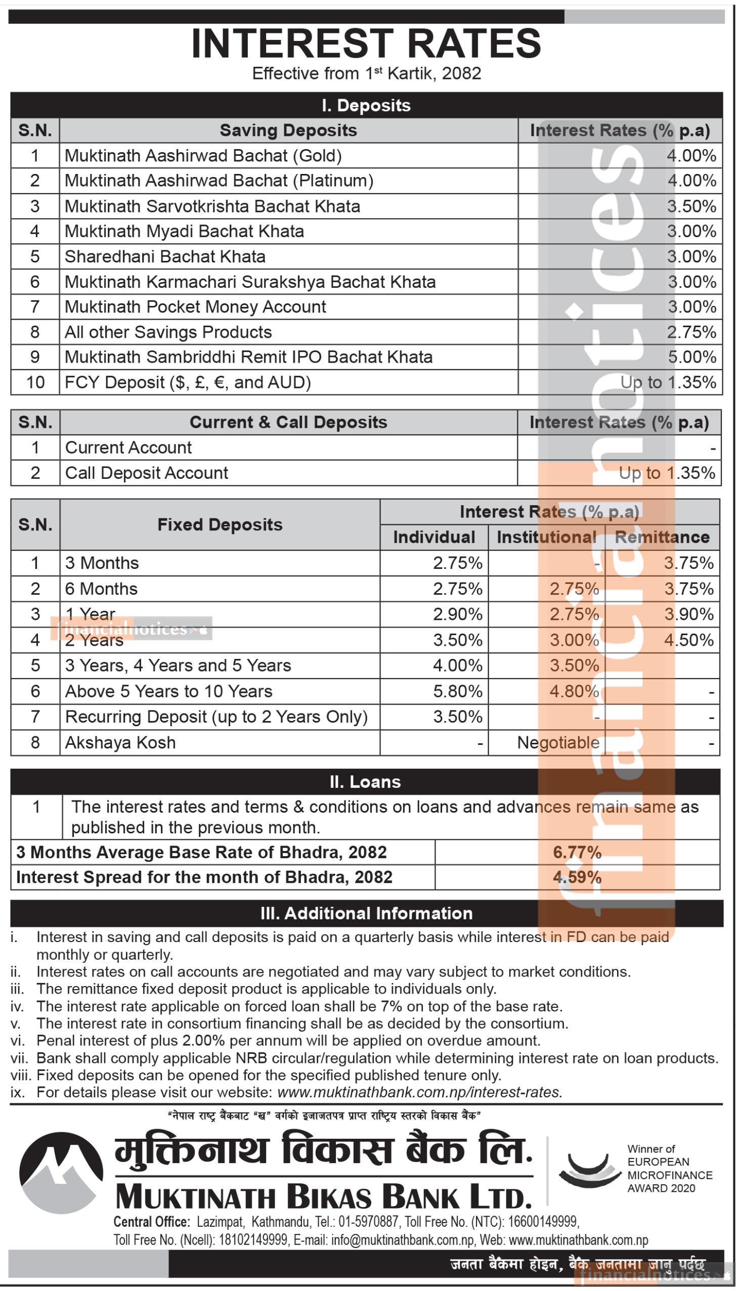 मुक्तीनाथ विकास बैंकको कात्तिक महिनाका लागि नयाँ ब्याजदर सार्वजनिक - Interest Rates -