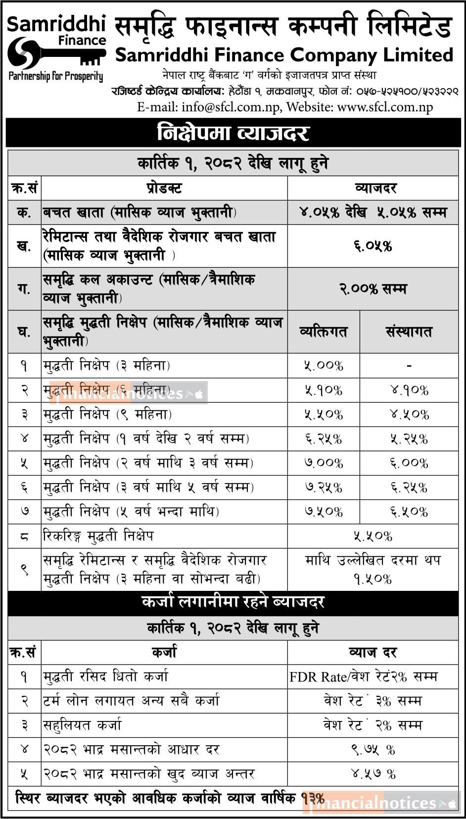 समृद्धि फाइनान्सको कार्तिकदेखि नयाँ ब्याजदर लागू – कुन खातामा कति पाइन्छ ब्याजदर ?