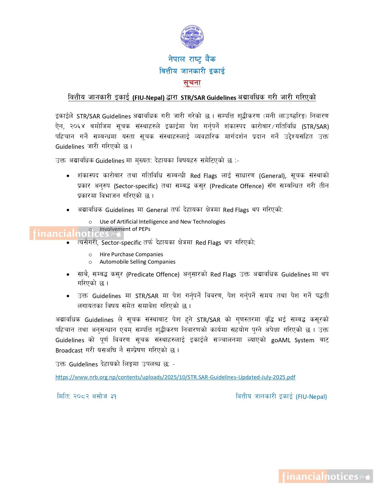 बित्तीय जानकारी इकाई (FIU-Nepal) द्वारा STR/STR Guidelines अद्यावधिक गरिएको सूचना