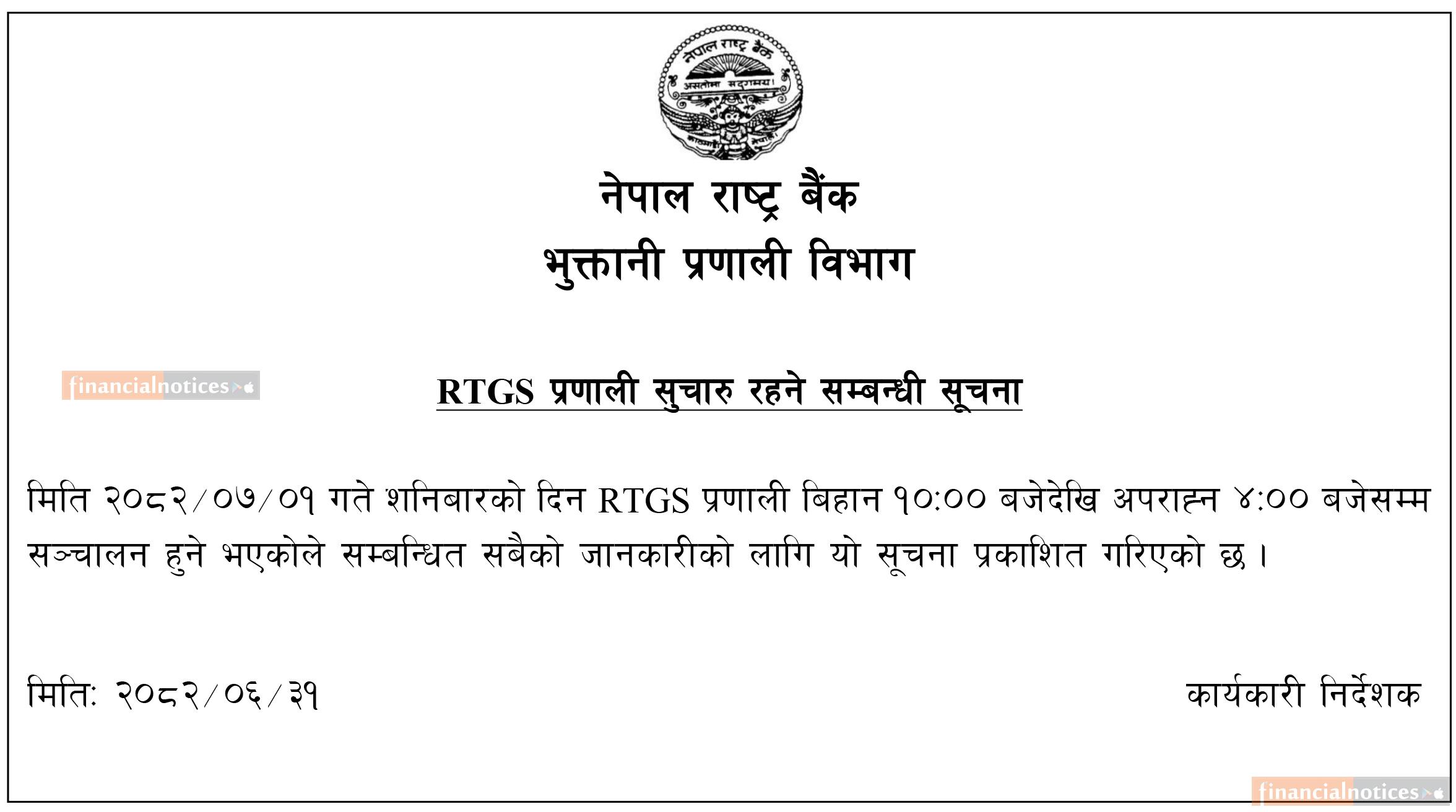 RTGS प्रणाली सुचारू रहने सम्बन्धी सूचना