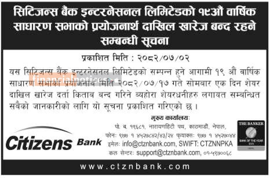 सिटिजन्स बैंकको १९औं वार्षिक साधारण सभाका लागि सेयर दर्ता बन्द हुने सम्बन्धी सूचना