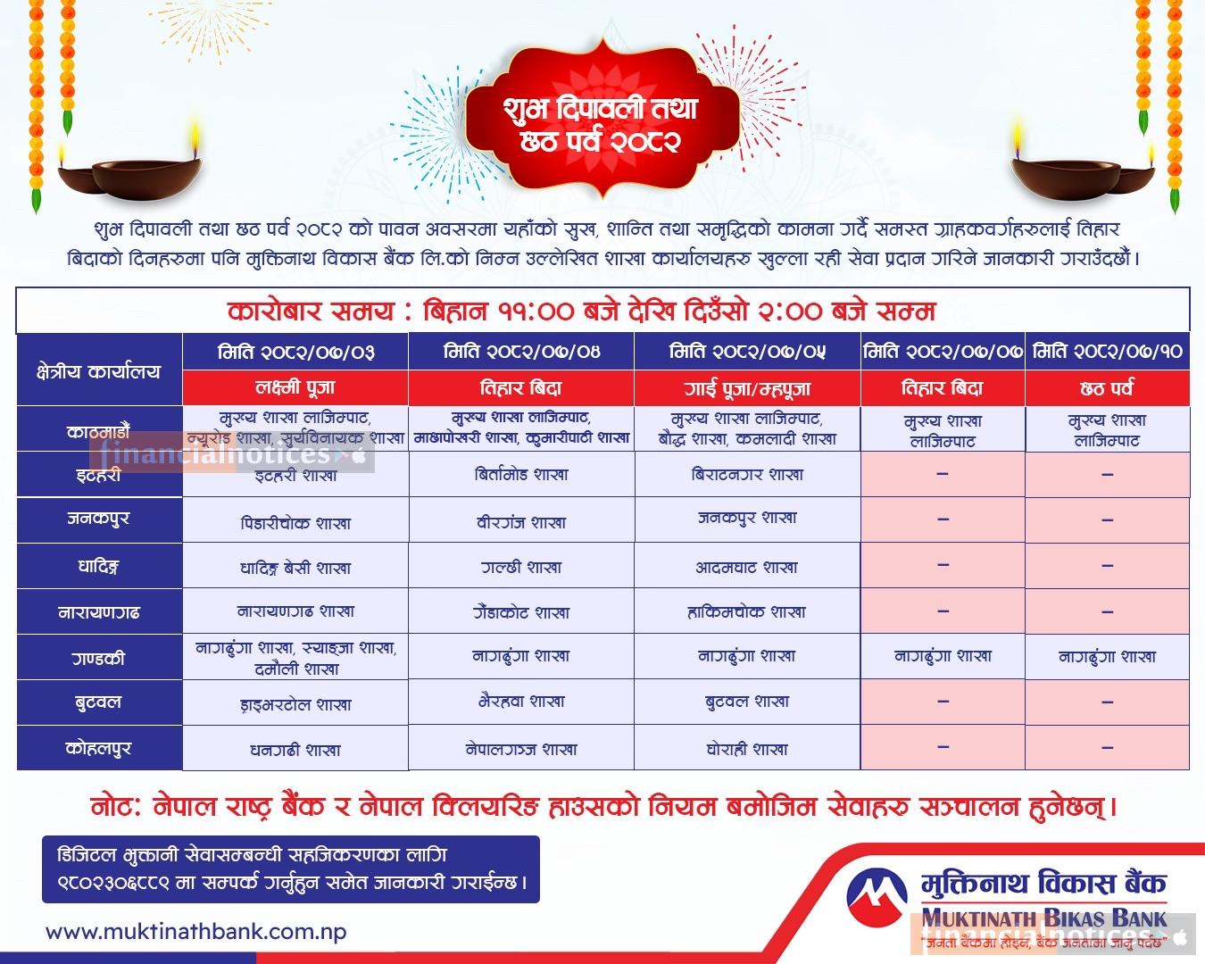 दिपावली तथा छठ पर्वमा शाखाहरु खुल्ला रहने बारे जरुरी सूचना