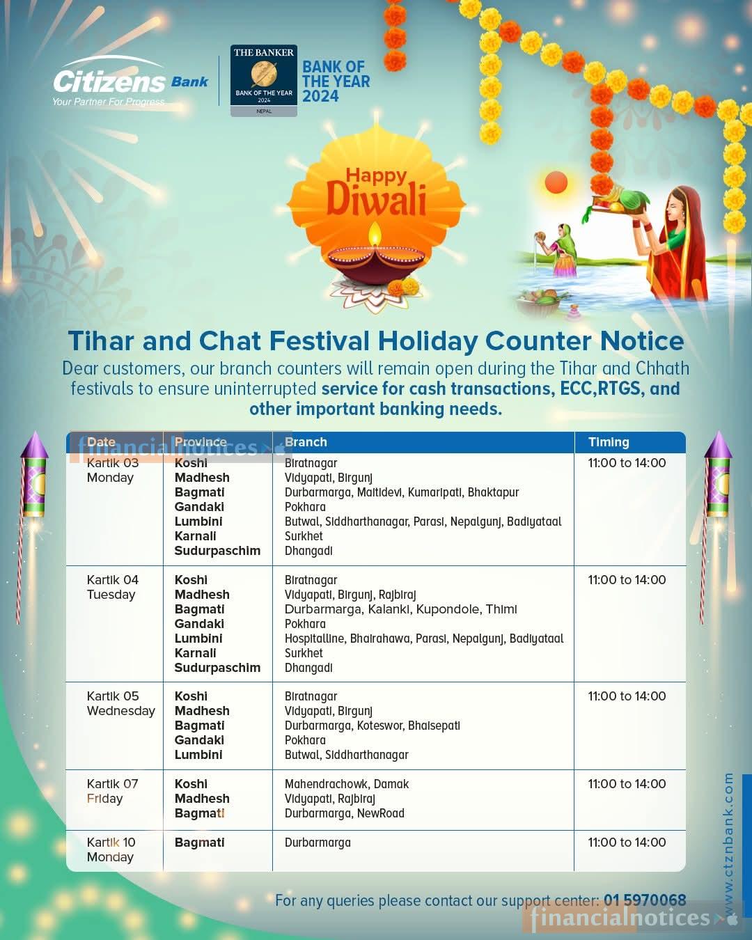 Citizens International Bank has announced that its branch counters will remain open during the Tihar and Chhath festivals to ensure uninterrupted services for cash transactions, ECC, RTGS and other essential banking needs.