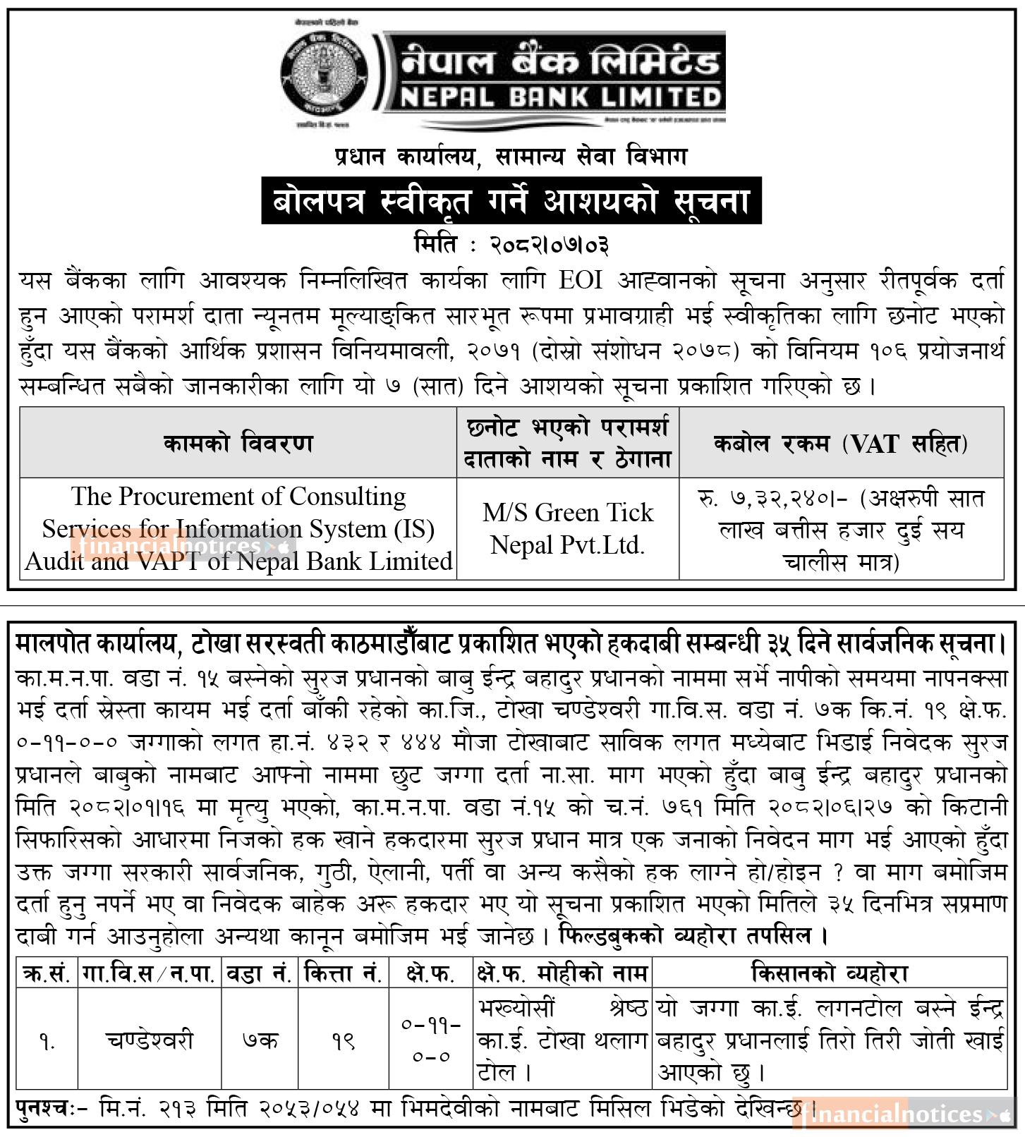 बोलपत्र स्वीकृत गर्ने आशयको सूचना