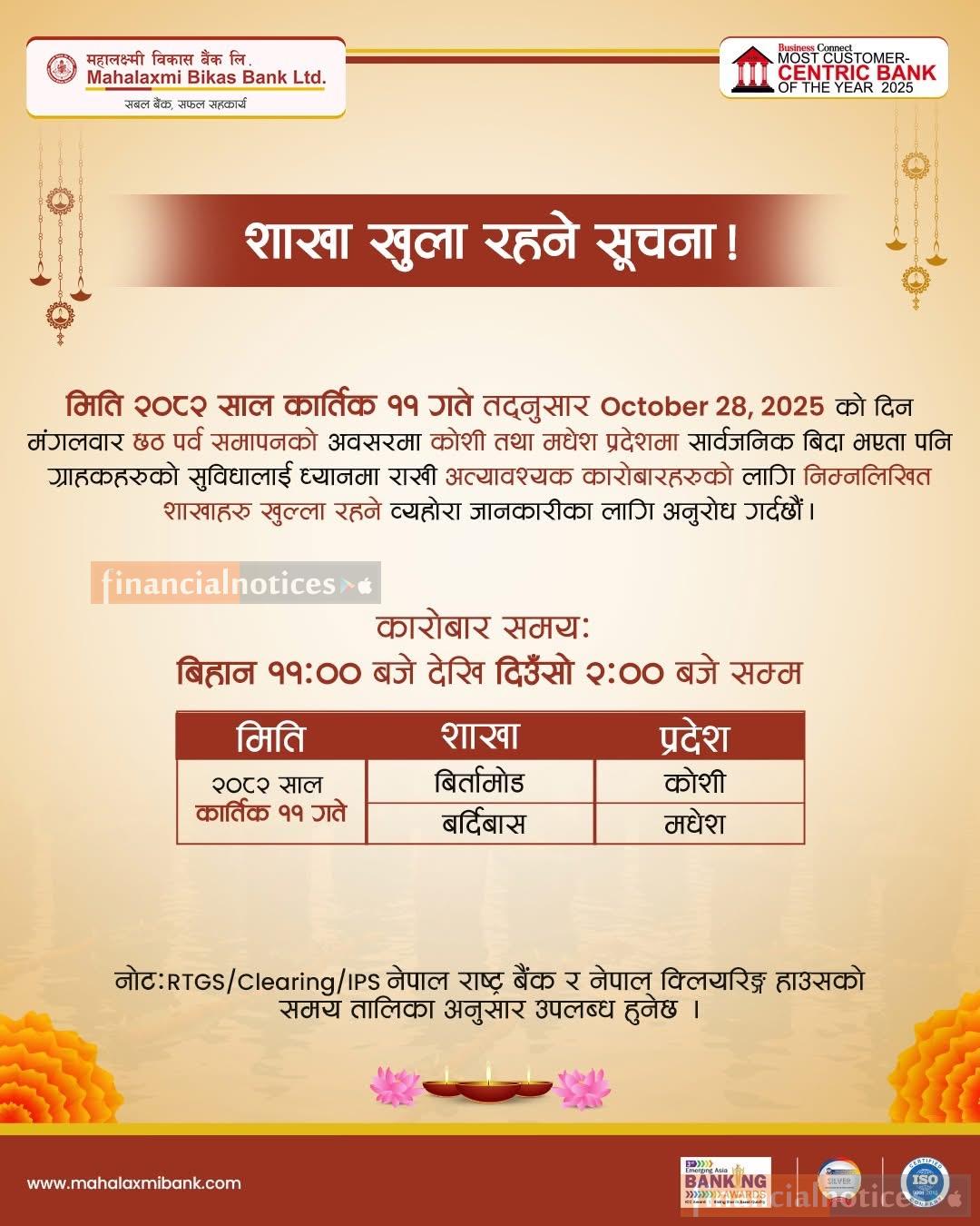 शाखा खुली रहने सम्बन्धी महालक्ष्मी विकास बैंकको सूचना -