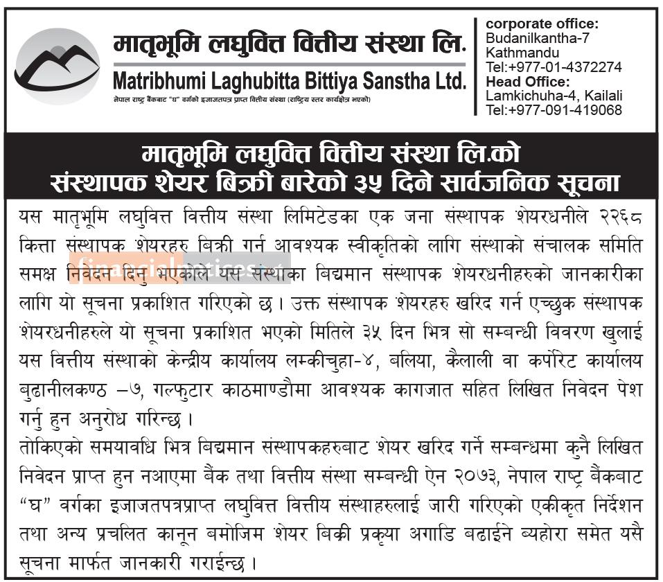 मातृभूमि लघुवित्त वित्तीय संस्थाका संस्थापक सेयर बिक्री सम्बन्धी ३५ दिने सूचना