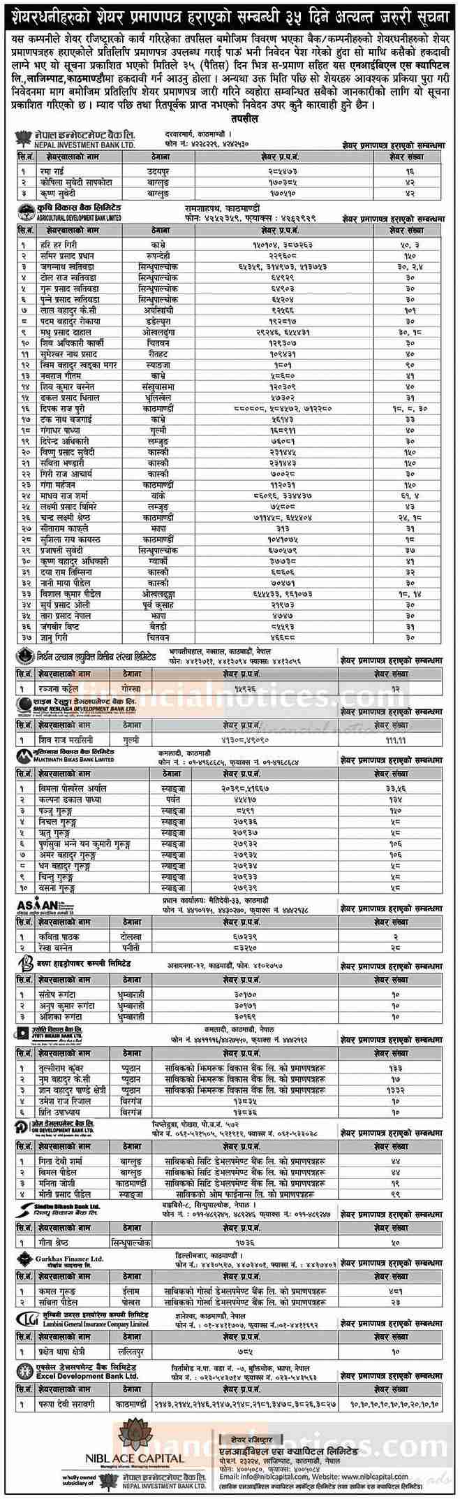 शेयर प्रमाणपत्र हराएको सम्बन्धी सूचना