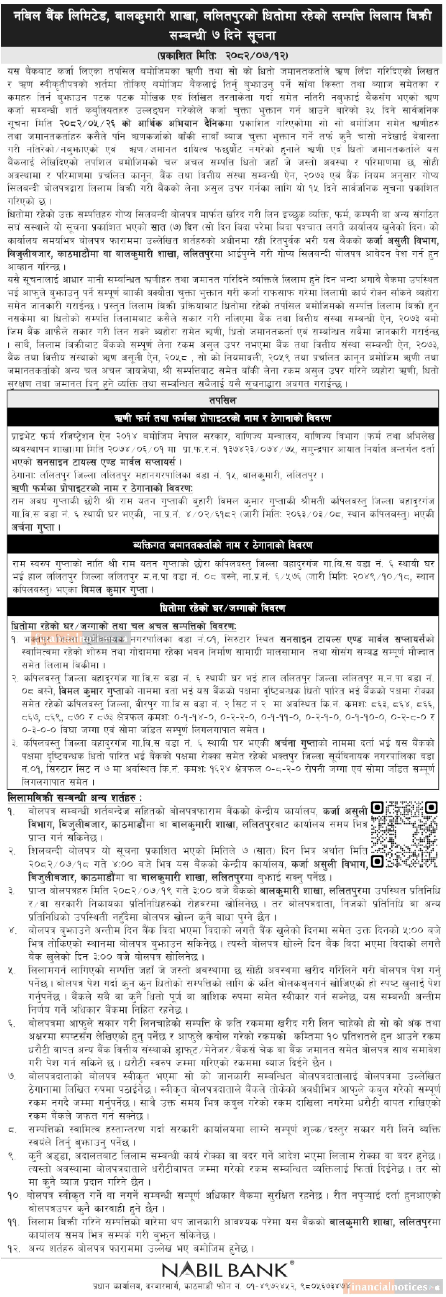 ललितपुरको धितोमा रहेको सम्पत्ति लिलाम बिक्री सम्बन्धी ७ दिने सूचना