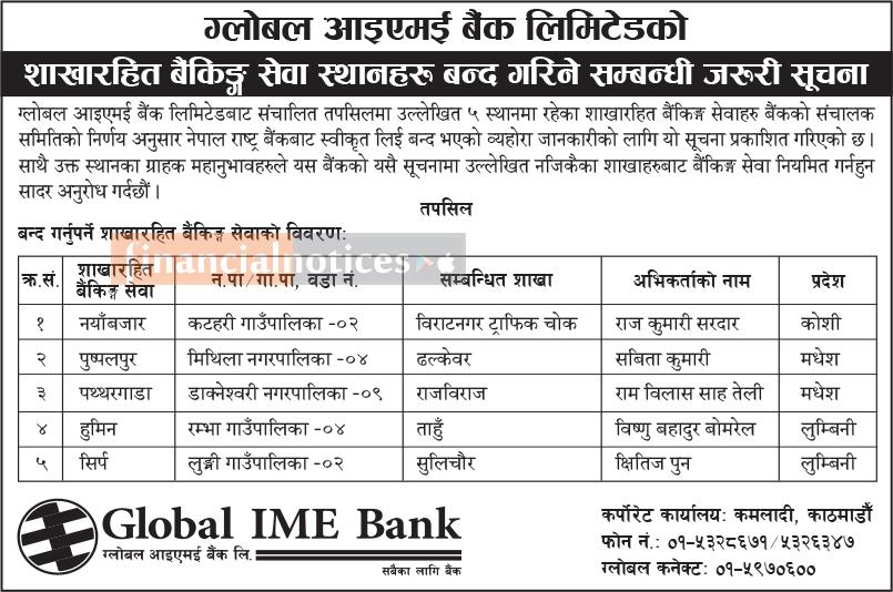 शाखा रहित बैंकिङ्ग सेवा स्थानहरु बन्द गरिने सम्बन्धी सूचना