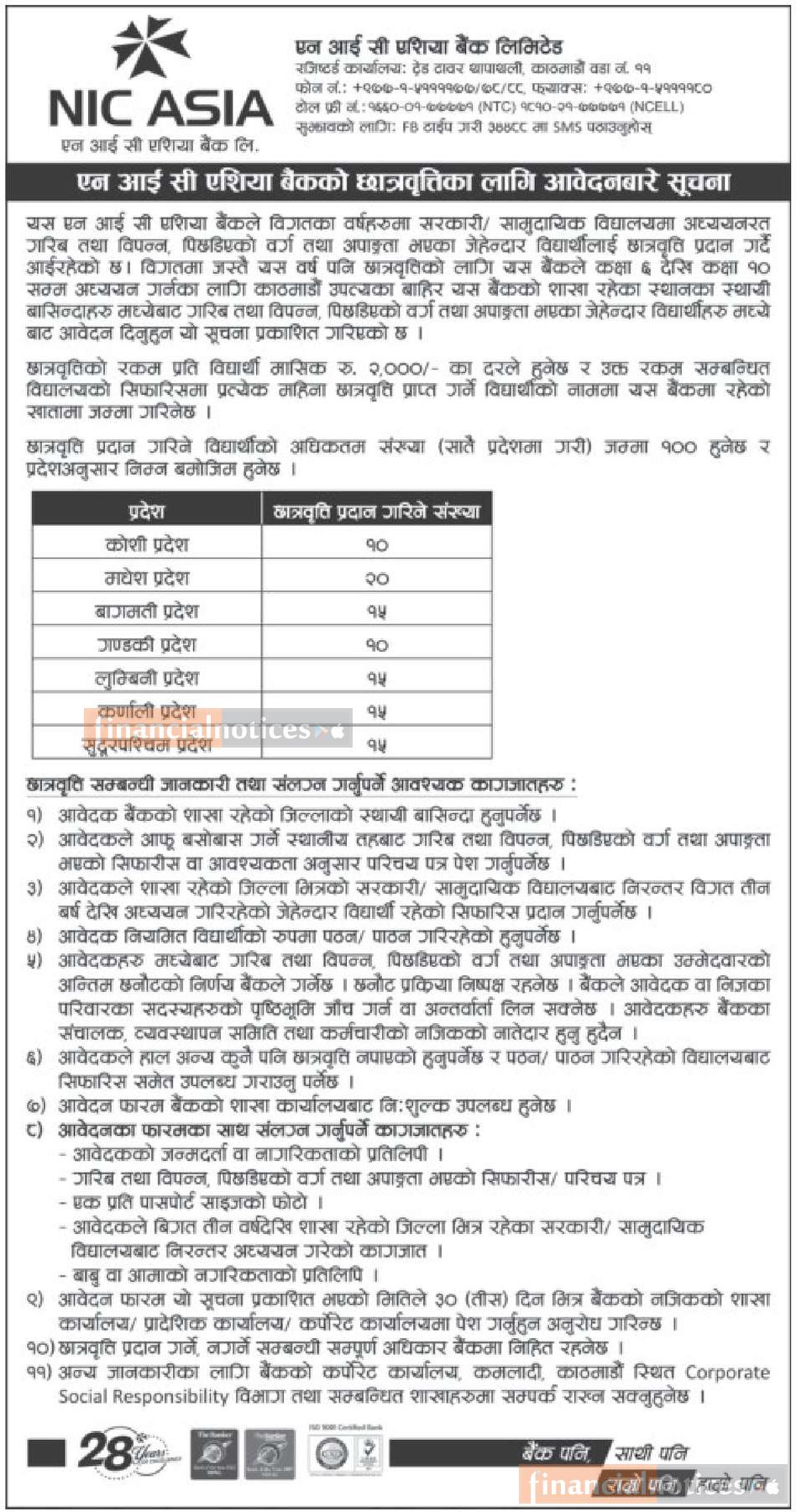 एन आई सी एशिया बैंकद्वारा देशभरका विपन्न विद्यार्थीका लागि छात्रवृत्ति घोषणा सम्बन्धी सूचना