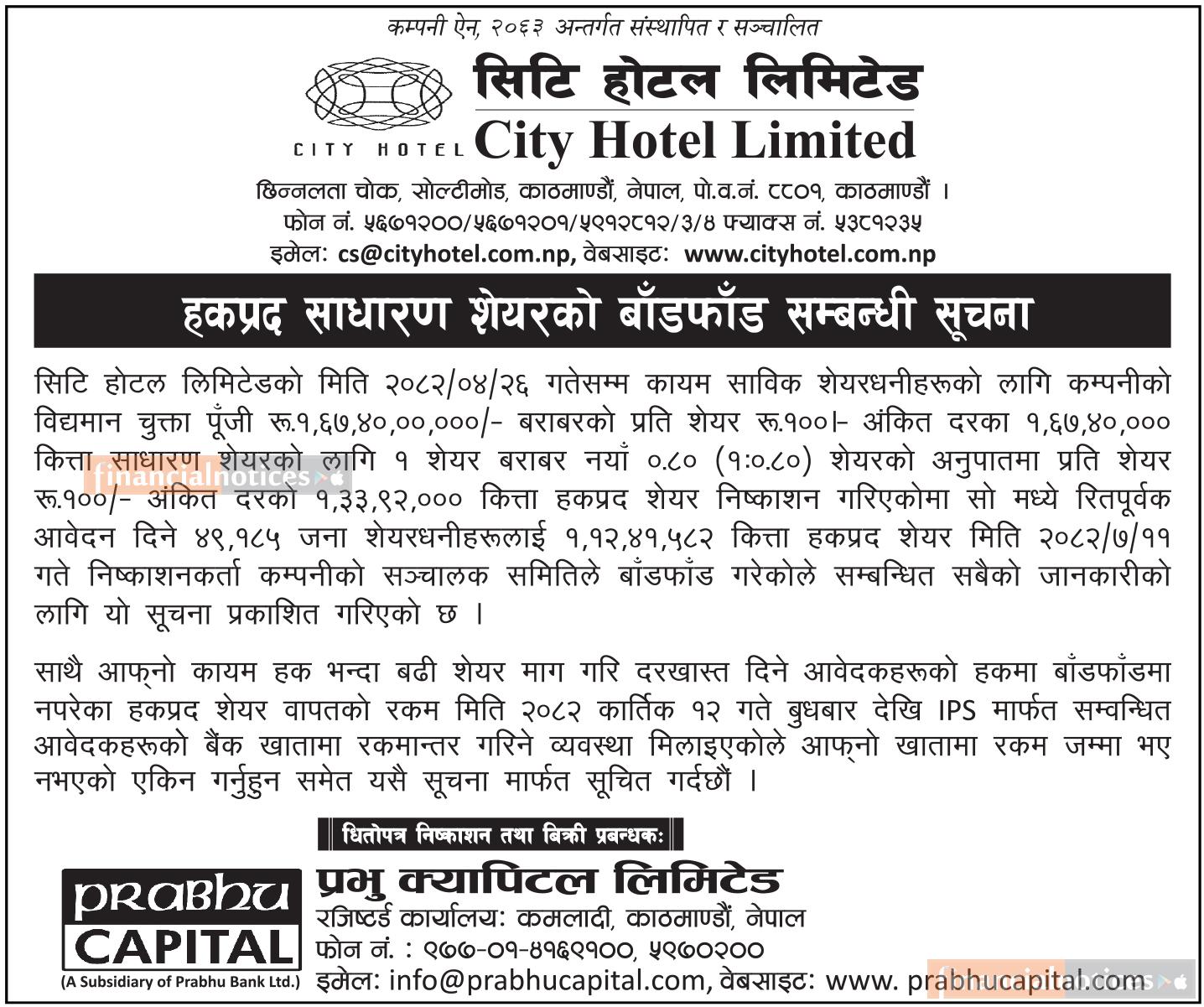 सिटि होटलको हकप्रद साधारण शेयर बाँडफाँड सम्बन्धी सूचना