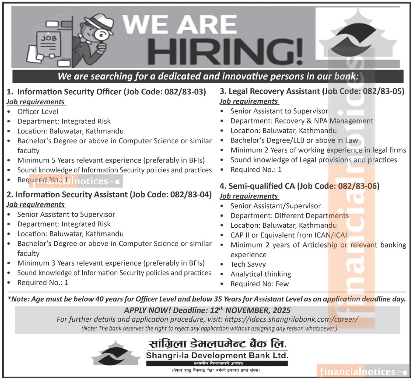 Kathmandu, Oct 2025 — Shangri-la Development Bank Limited has announced several job openings for qualified and motivated individuals to join its team in various departments at its central office in Baluwatar, Kathmandu.