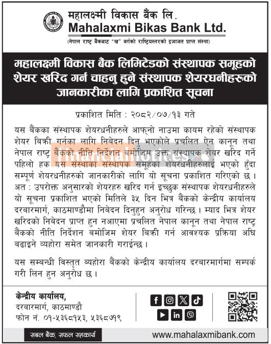 महालक्ष्मी विकास बैंकको संस्थापक सेयर खरिद गर्न इच्छुक लगानीकर्ताका लागि सूचना