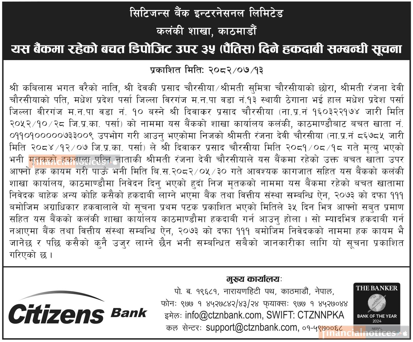 बैंकमा रहेको बचत डिपोजिट उपर ३५ दिने हकदावी सम्बन्धी सूचना