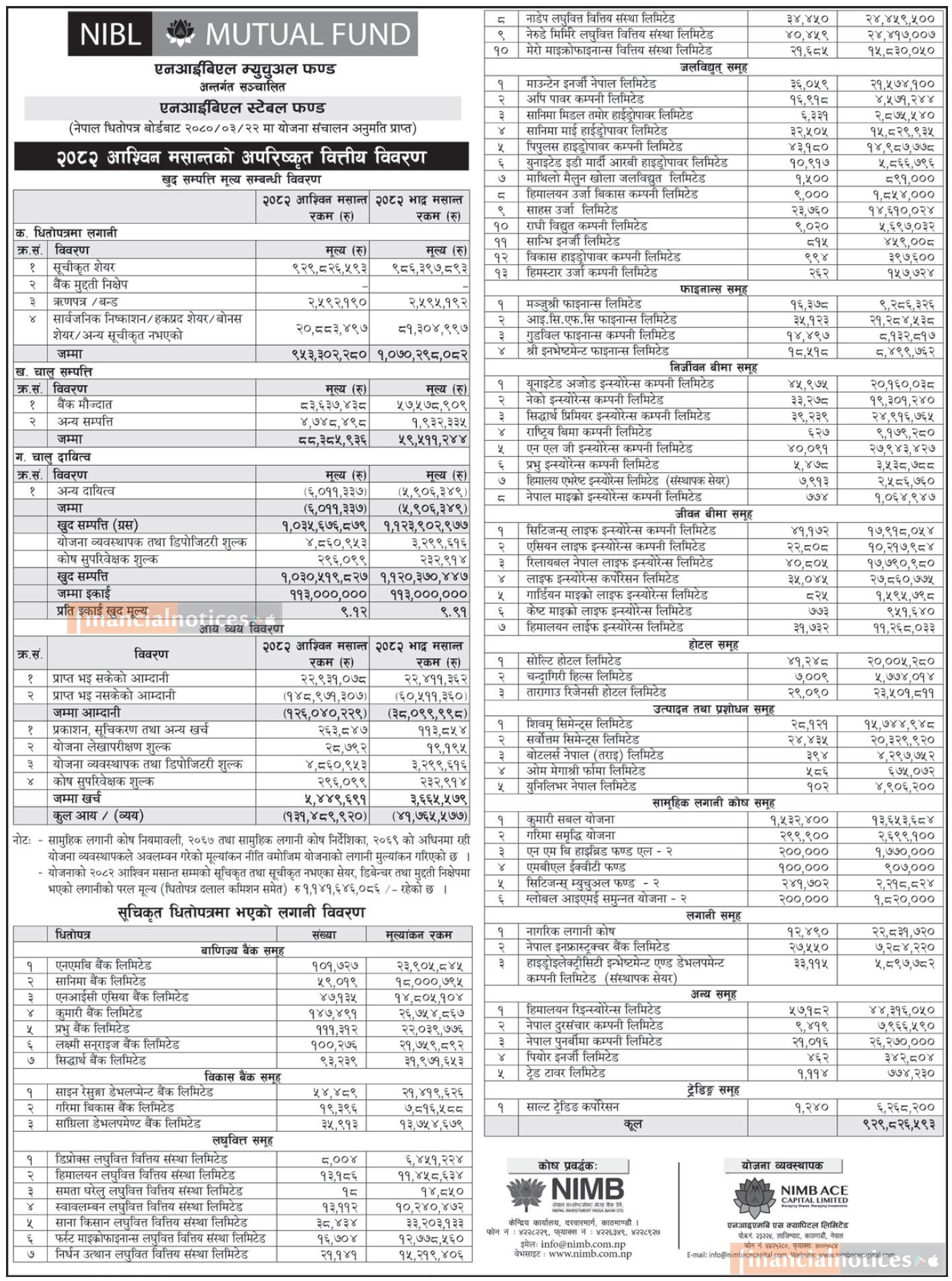 NIMB Ace Capital has published “NIBL Stable Fund” Net Assets Value till Ashwin, 2082