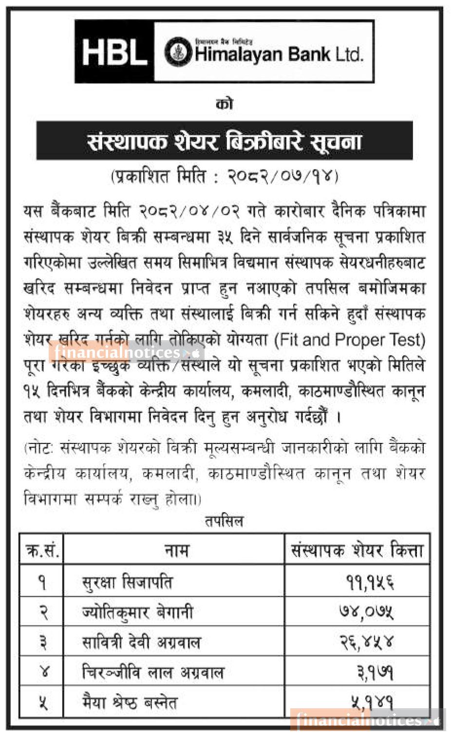 संस्थापक सेयर बिक्रीका लागि हिमालयन बैंकको सूचना