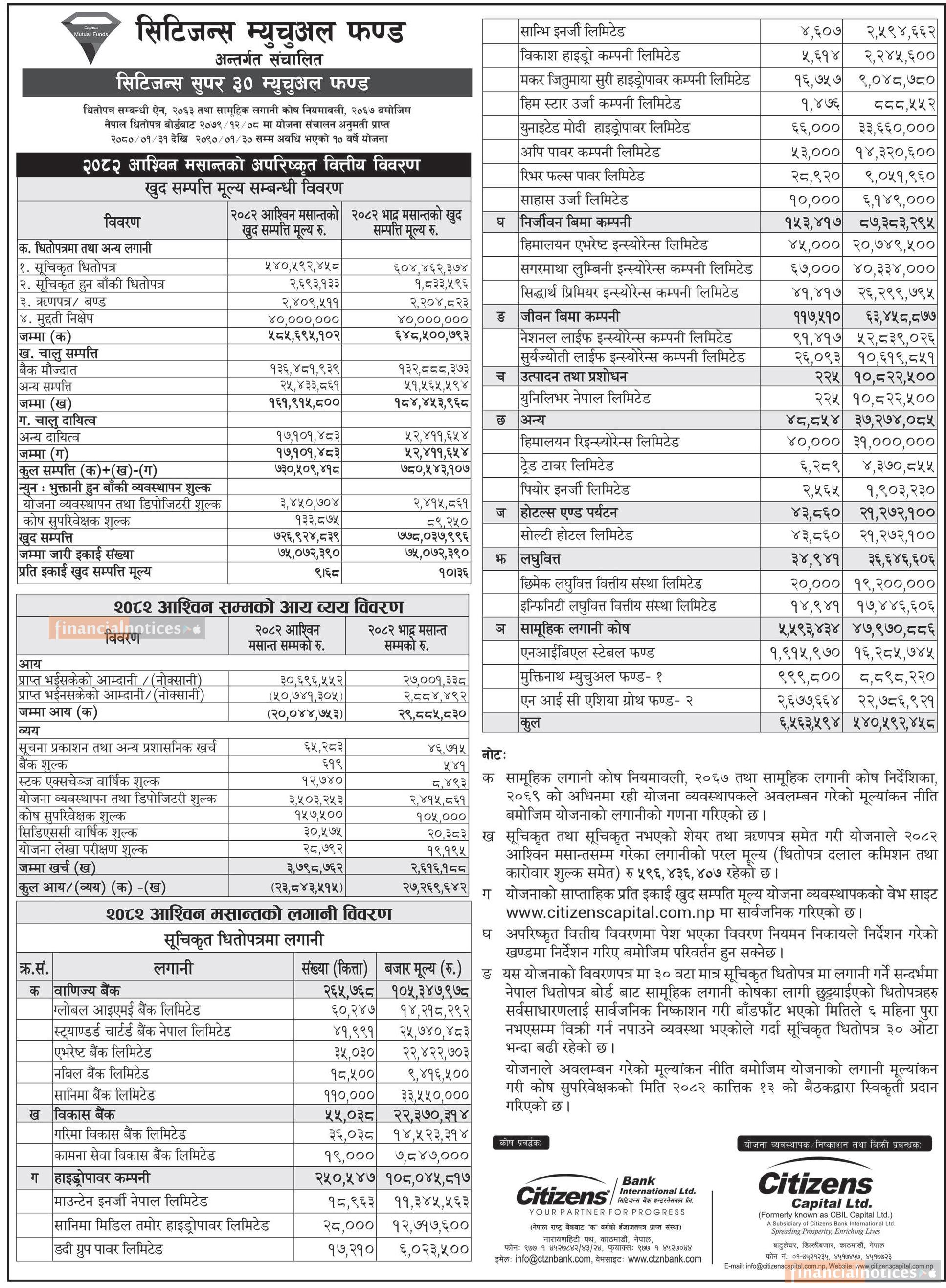 Citizens Capital has published “Citizens Super 30 Mutual Fund” Net Assets Value till Ashwin, 2082