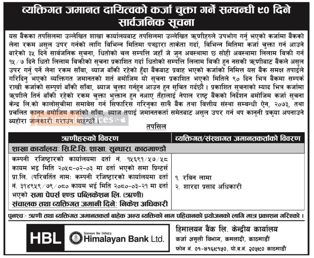व्यत्तिगत जमानत दायीत्व कर्जा चुत्ता गर्ने सम्बन्धी हिमालयन बैंकको ९० दिने सूचना -