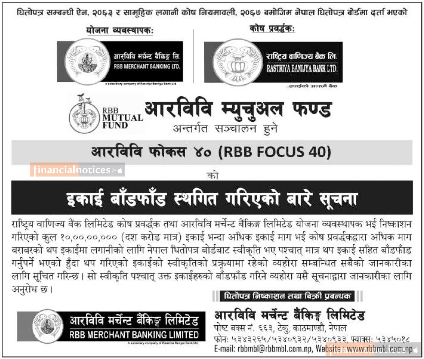 आरबिवी फोकस ४० को इकाईको बाँडफाँड स्थगित गरिएको सम्बन्धी सूचना