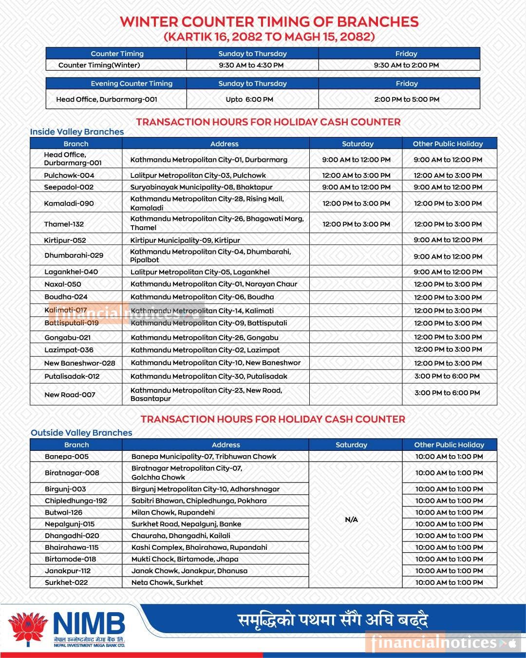 Nepal Investment Mega Bank (NIMB) informs all valued customers that winter counter hours will be effective from Kartik 16, 2082 to Magh 15, 2082. Branch counters will operate from 9:30 AM to 4:30 PM (Sunday–Thursday) and 9:30 AM to 2:00 PM (Friday). The notice also provides holiday cash counter hours for inside and outside valley branches.