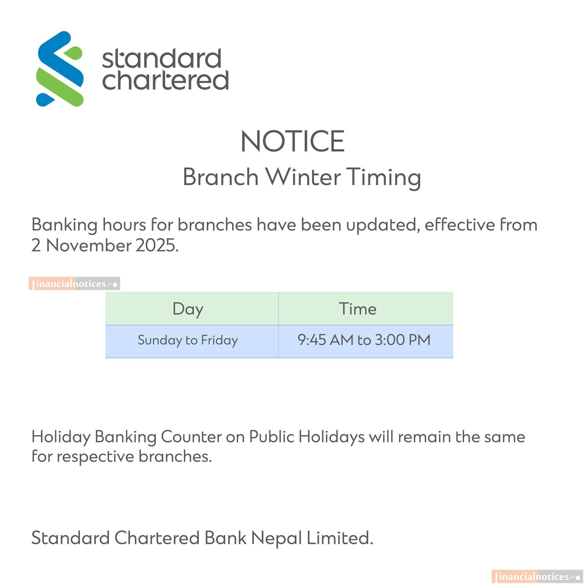 Standard Chartered Bank Nepal Limited has updated its Branch Winter Timing, effective from 2 November 2025. The new banking hours for Sunday to Friday are 9:45 AM to 3:00 PM. Please note that the Holiday Banking Counter timing on Public Holidays remains unchanged for the respective branches.