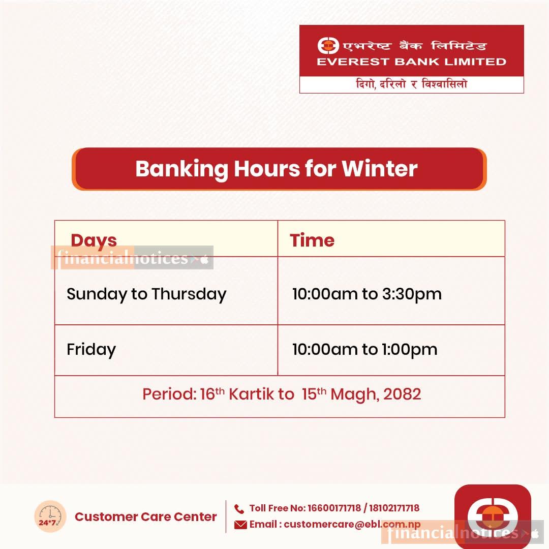 Everest Bank Limited (EBL) has announced its updated Winter Banking Hours, effective from 16th Kartik to 15th Magh, 2082 (as per the Nepali calendar).