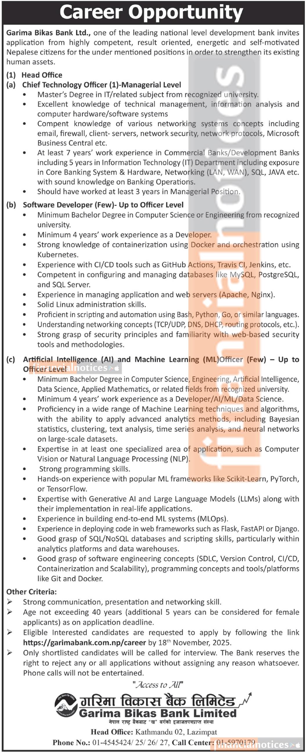 Kathmandu, Nov 4: Garima Bikas Bank Ltd., one of Nepal’s leading national-level development banks, has announced new job openings to strengthen its IT and technology division. The bank is inviting applications from qualified, result-oriented, and self-motivated Nepali citizens for several positions at its head office.