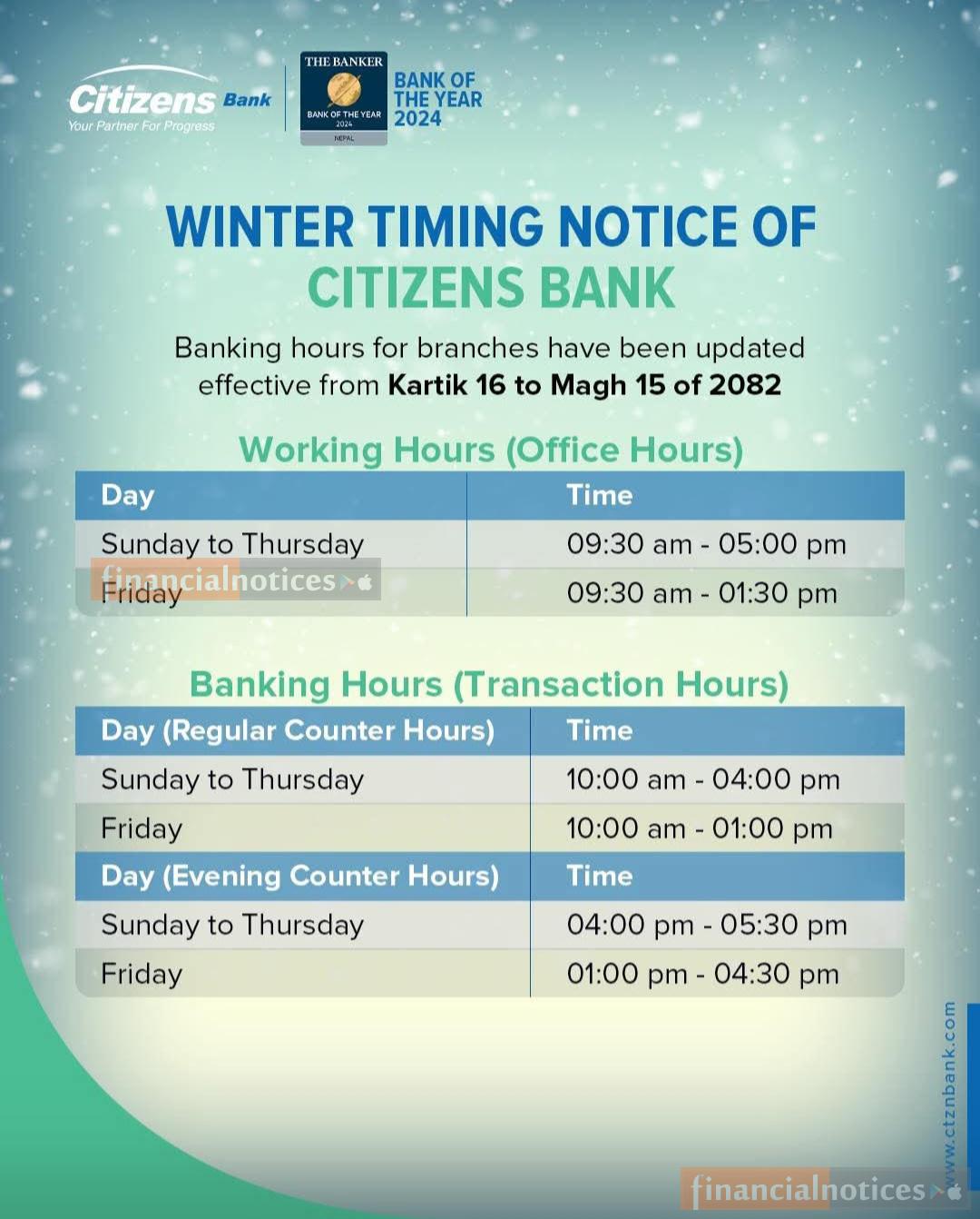 Citizens Bank has updated its branch working hours effective from Kartik 16 to Magh 15, 2082. As per the new winter schedule, office hours will be from 9:30 AM to 5:00 PM (Sunday to Thursday) and 9:30 AM to 1:30 PM (Friday). Regular transaction hours are set from 10:00 AM to 4:00 PM (Sunday to Thursday) and 10:00 AM to 1:00 PM (Friday), while evening counter services will operate from 4:00 PM to 5:30 PM (Sunday to Thursday) and 1:00 PM to 4:30 PM (Friday).