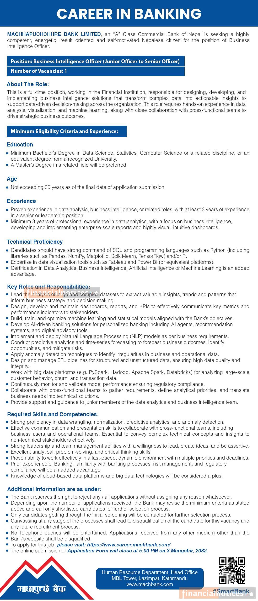 Kathmandu: Machhapuchchhre Bank Limited, an “A” class commercial bank of Nepal, has announced a vacancy for the position of Business Intelligence Officer (Junior Officer to Senior Officer level). The bank is seeking a competent, result-oriented, and self-motivated Nepalese citizen to join its data and analytics division.