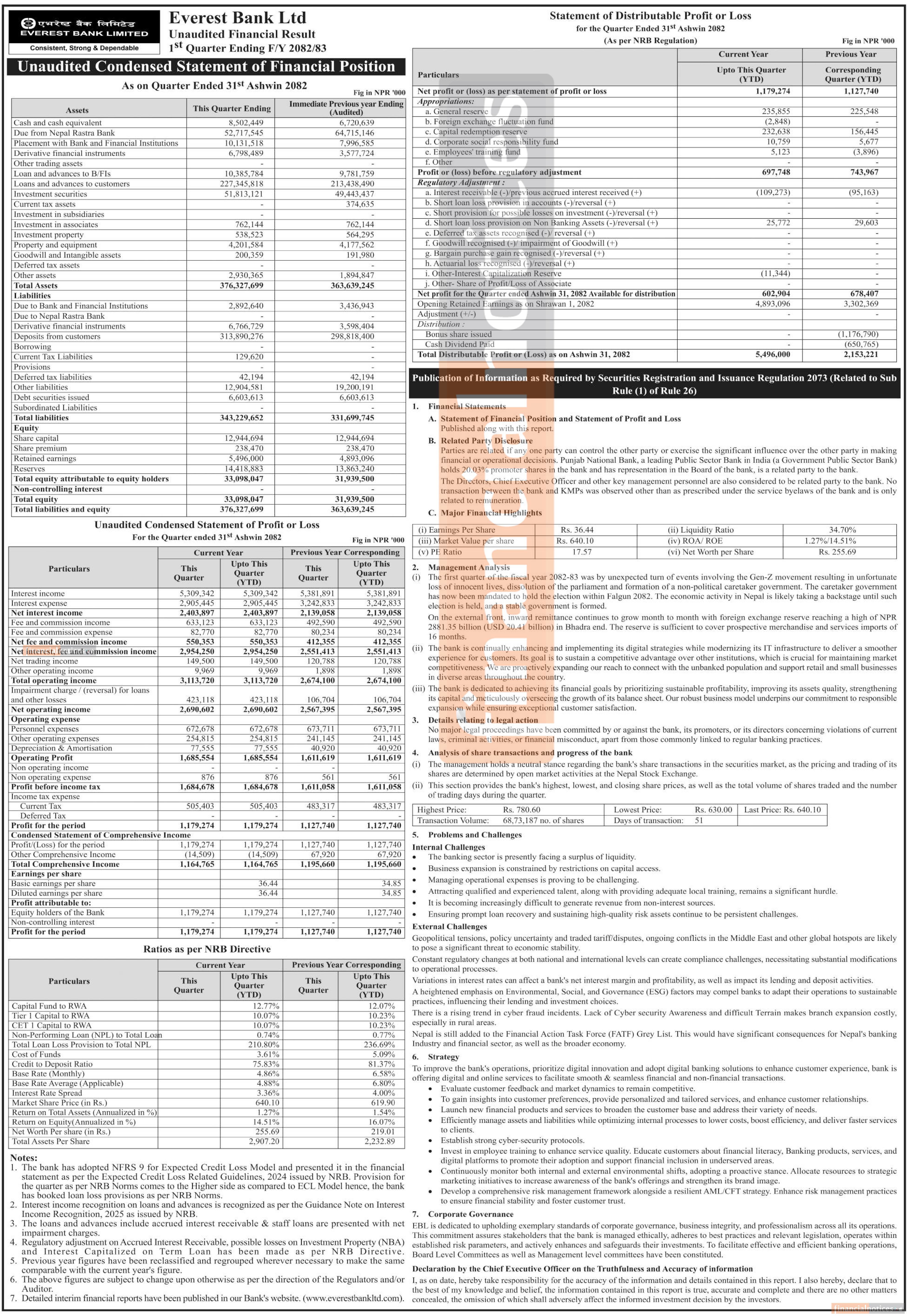 Kathmandu - Everest Bank Limited has posted a net profit of NPR 1.17 billion in the first quarter of FY 2082/83, marking a modest increase of around NPR 50 million compared to the same period last year.