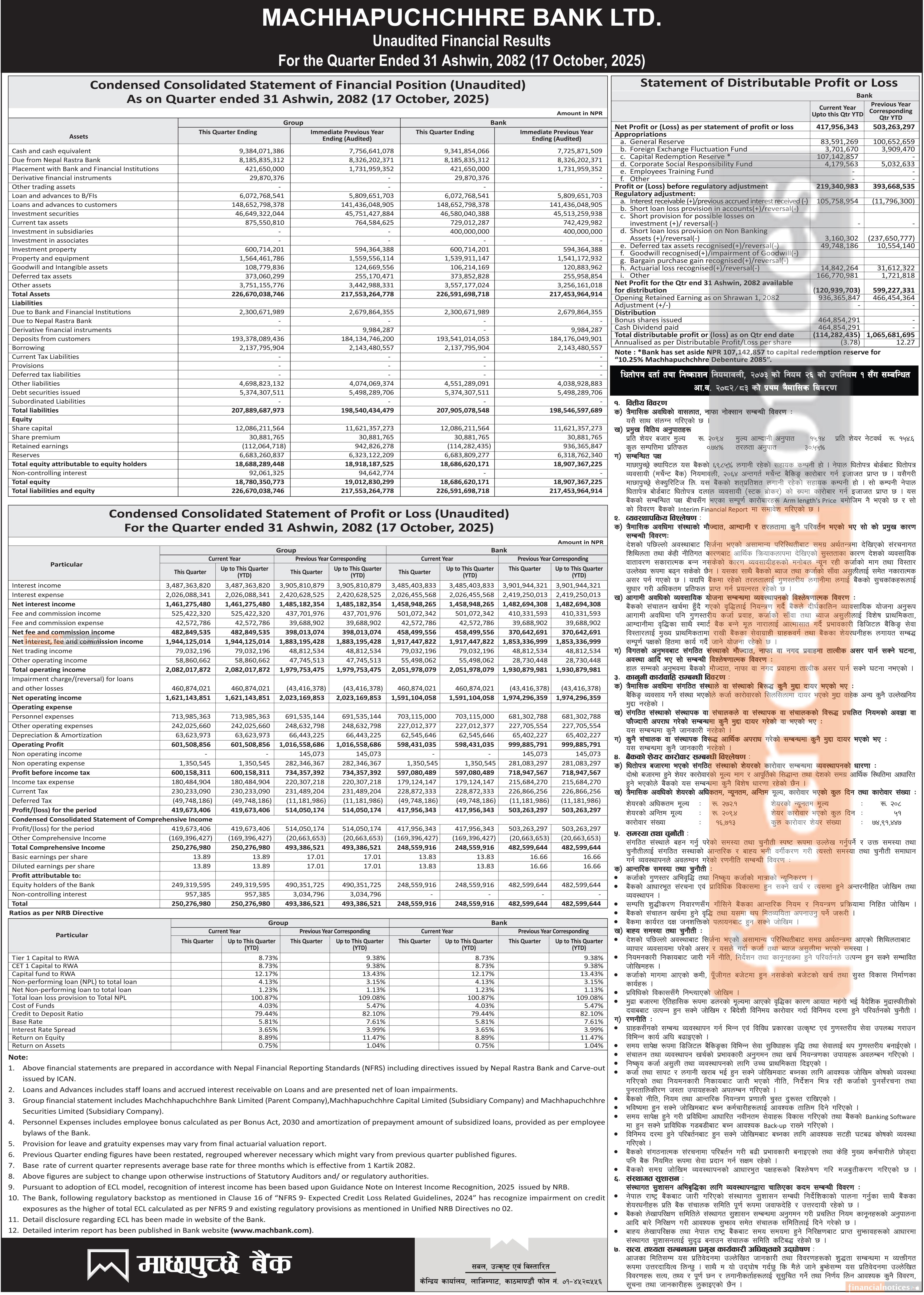 Machhapuchchhre Bank has a paid-up capital of NPR 12.08 billion and reserves totaling NPR 6.57 billion. As of the end of the first quarter, the bank had collected deposits worth NPR 193 billion and disbursed loans totaling NPR 148 billion.