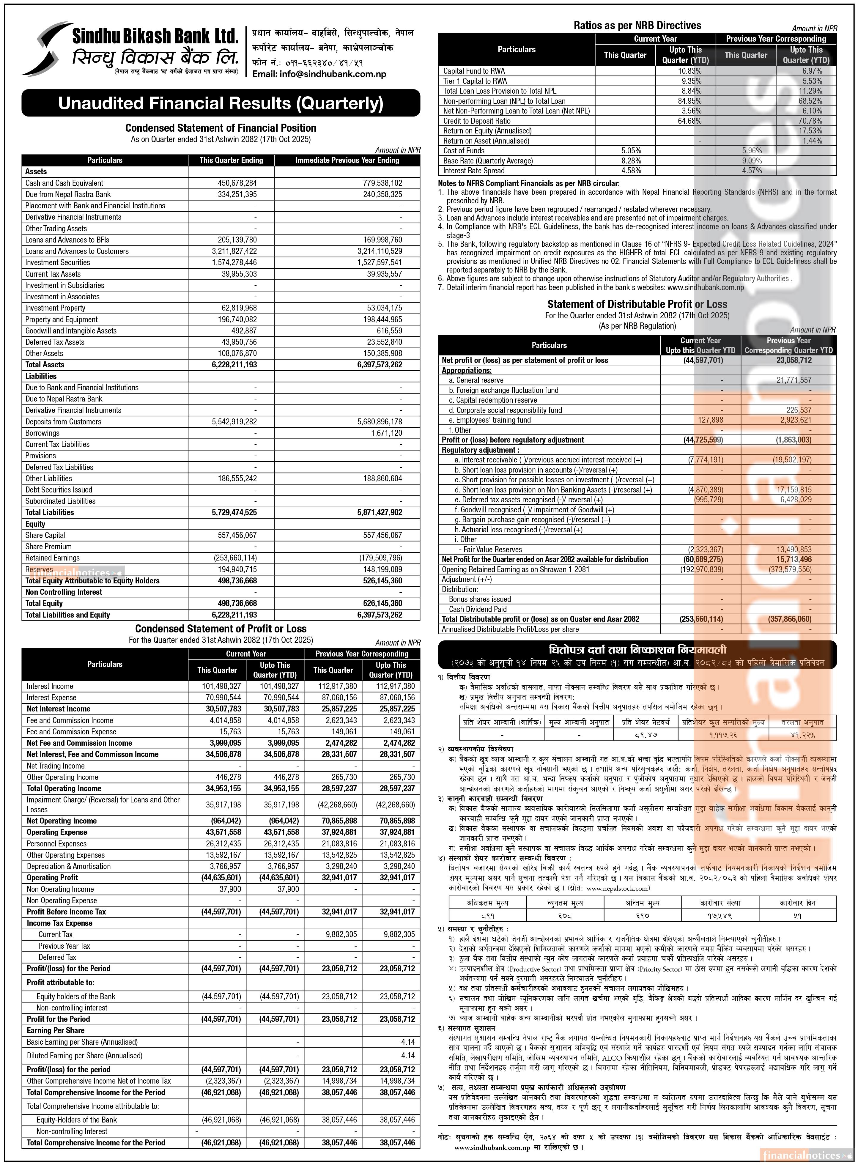 Sindhu Bikas Bank has posted a net loss of Rs 44.59 million and published its 1st quarter