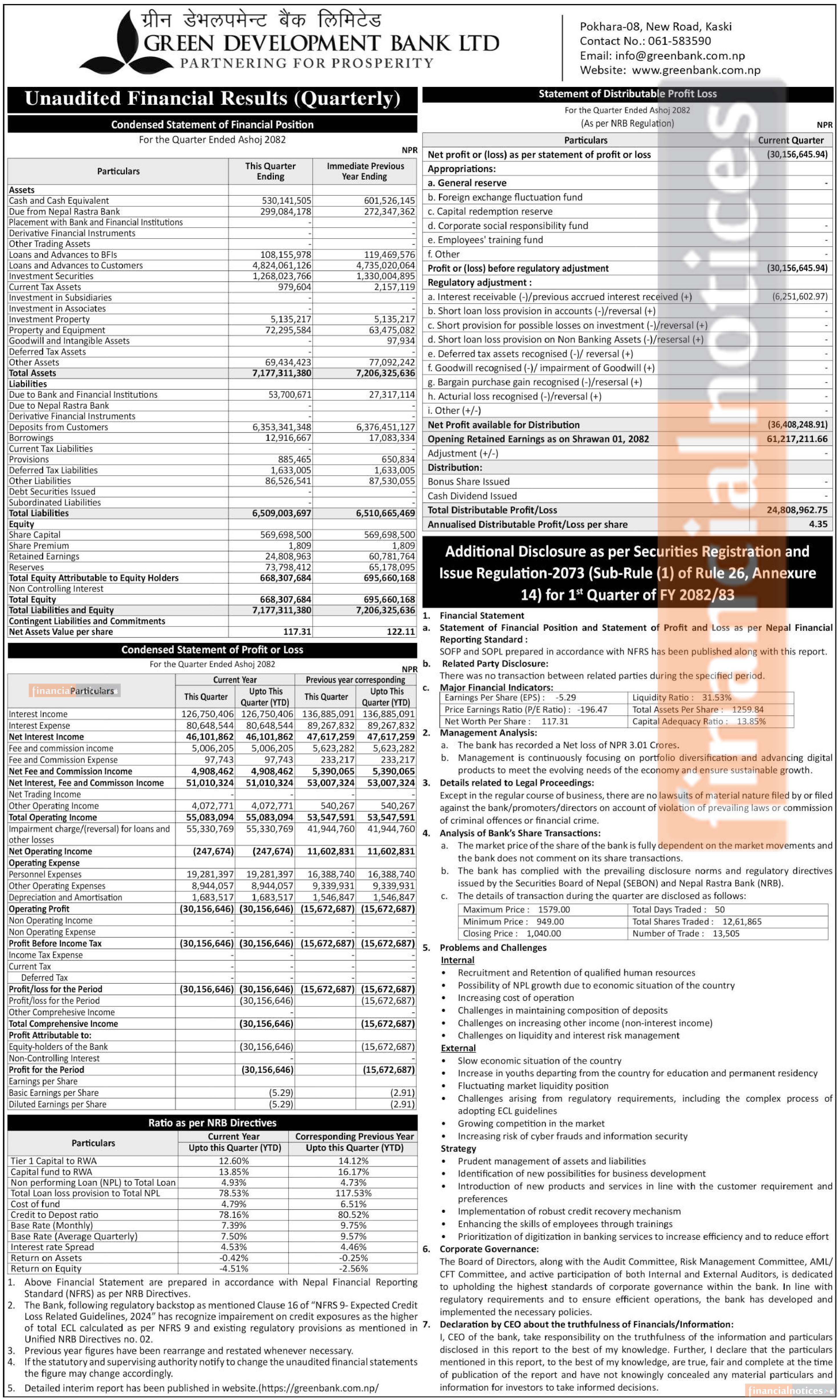 Green Development Bank has posted a net loss of Rs 30.15 million and published its 1st quarter