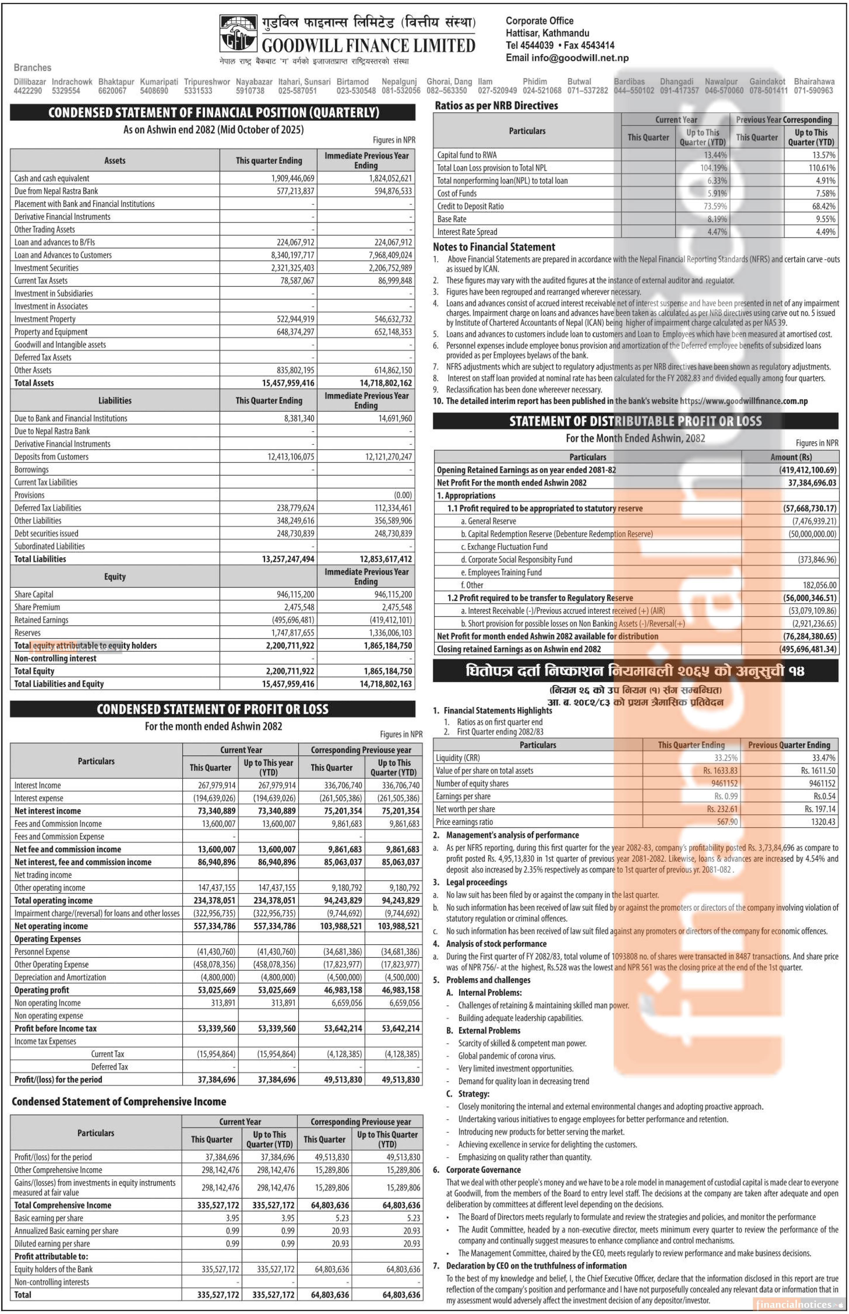 Goodwill Finance has posted a net profit of Rs 37.38 million and published its 1st quarter