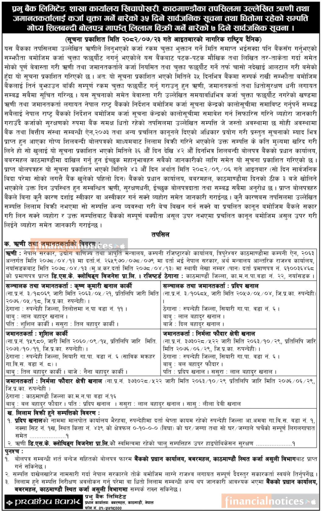 ऋणी र जमानीकर्ताको धितो सम्पत्ती बोलपत्र मार्फत बिक्री गर्नेबारे प्रभु बैंकको सूचना -