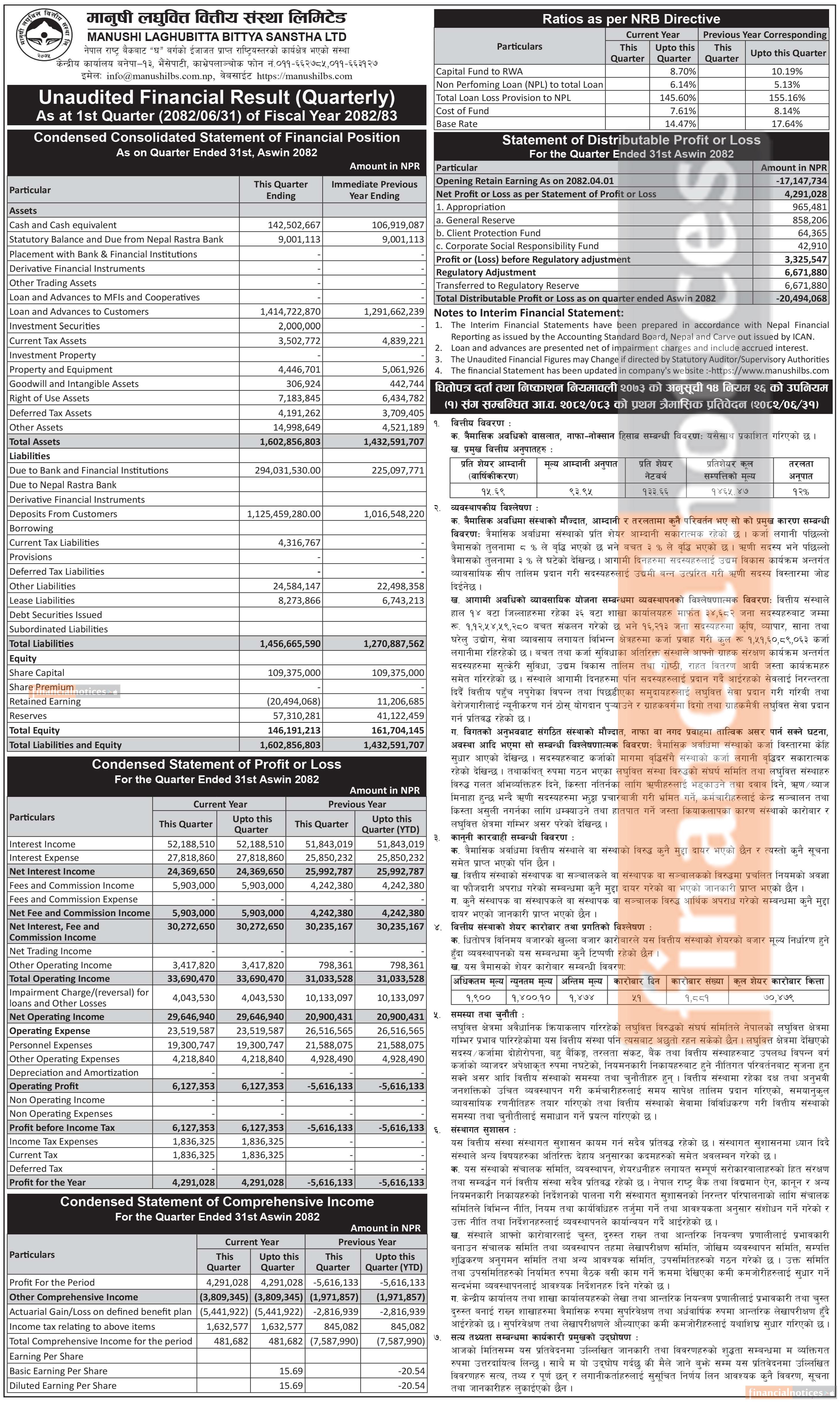 मानुषी लघुवित्तको पहिलो त्रैमासमा खुद नाफा ४२ लाख ९१ हजार रुपैयाँ - Q1 Report -