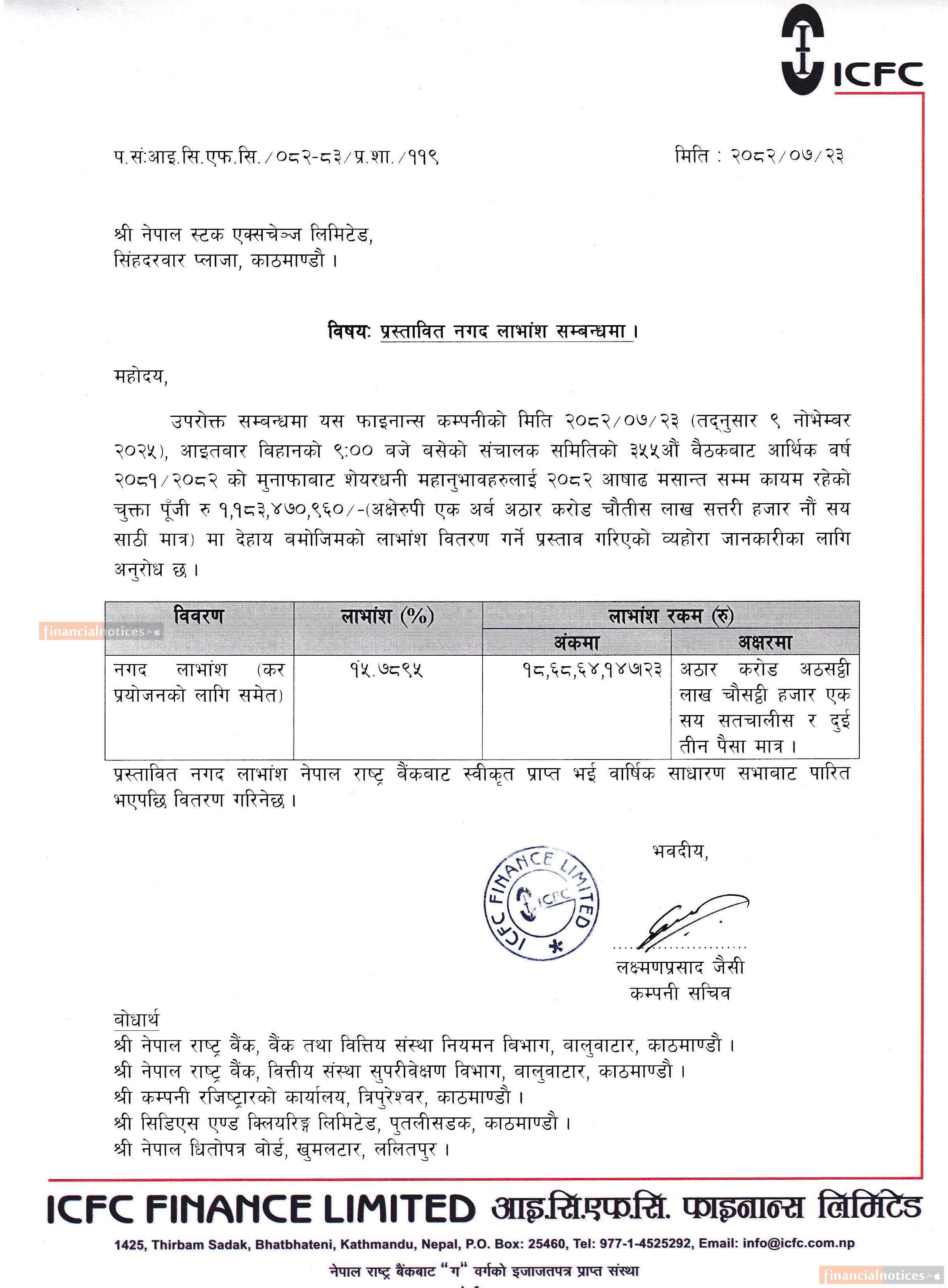 आइसिएफसि फाइनान्सको लाभांश घोषणा सम्बन्धी सूचना, नगद र बोनस कति ?