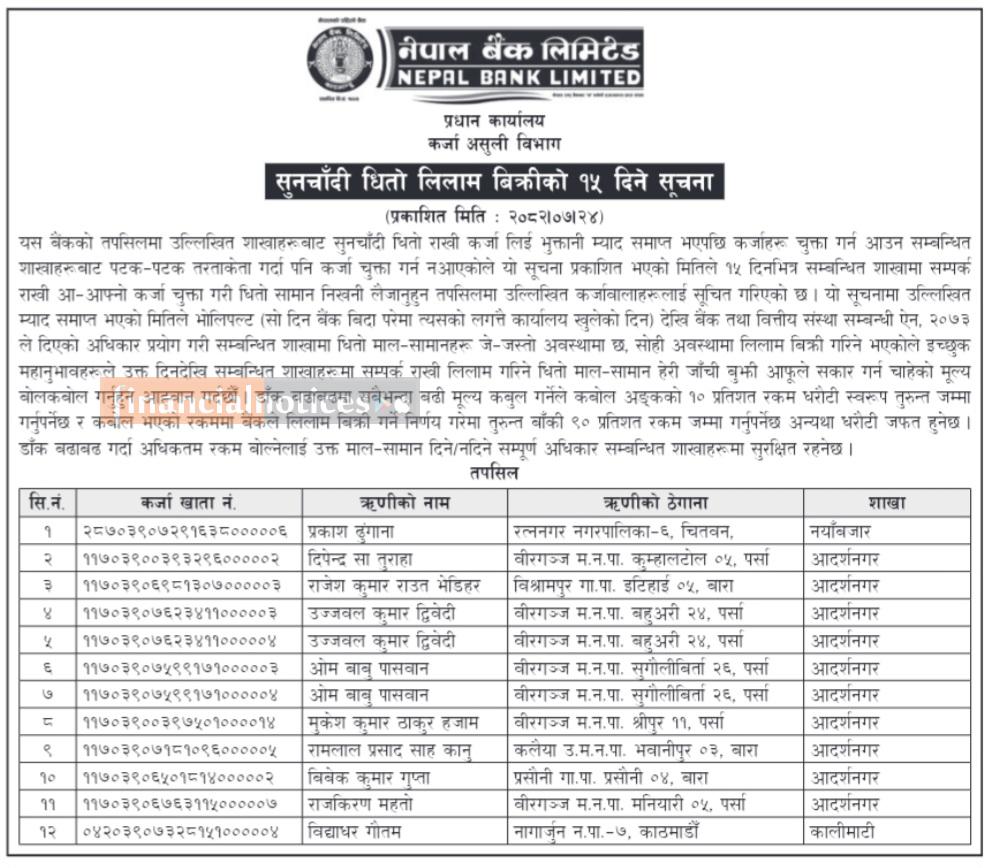 सुन चाँदि धितो लिलाम बिक्री गर्ने सम्बन्धमा नेपाल बैंकको सूचना -