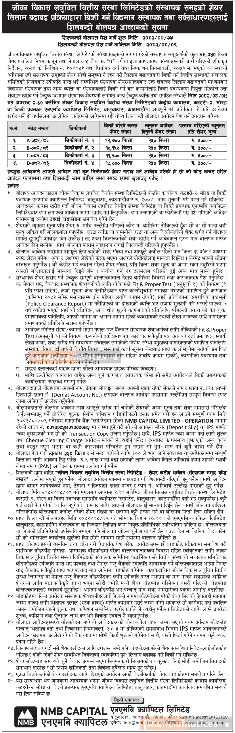 जीवन विकास लघुवित्तको ४५ हजारभन्दा बढी संस्थापक सेयर लिलामी सम्बन्धी सूचना
