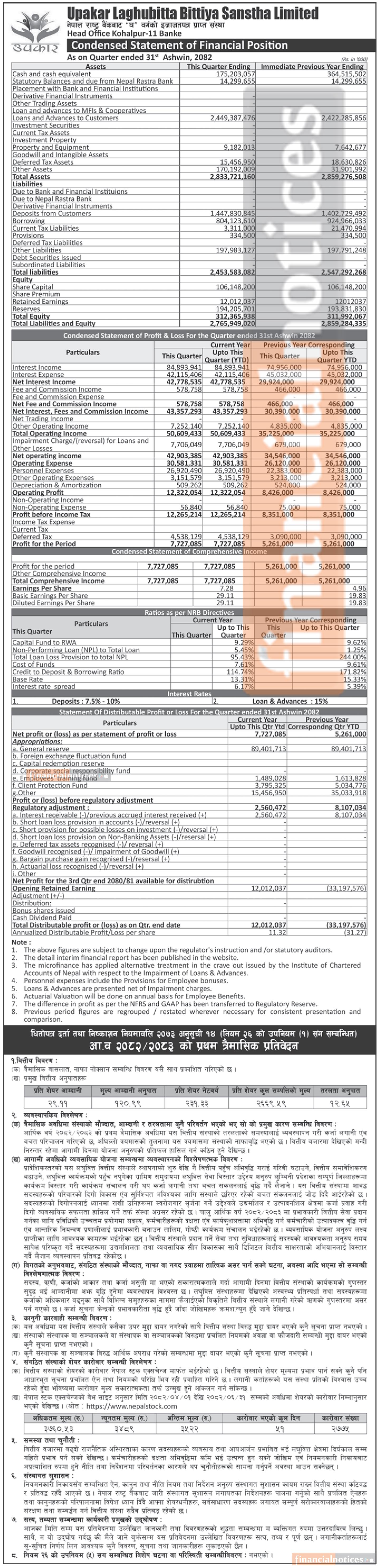 Upakar Laghubitta has posted a net profit of Rs 7.72 million and published its Q1