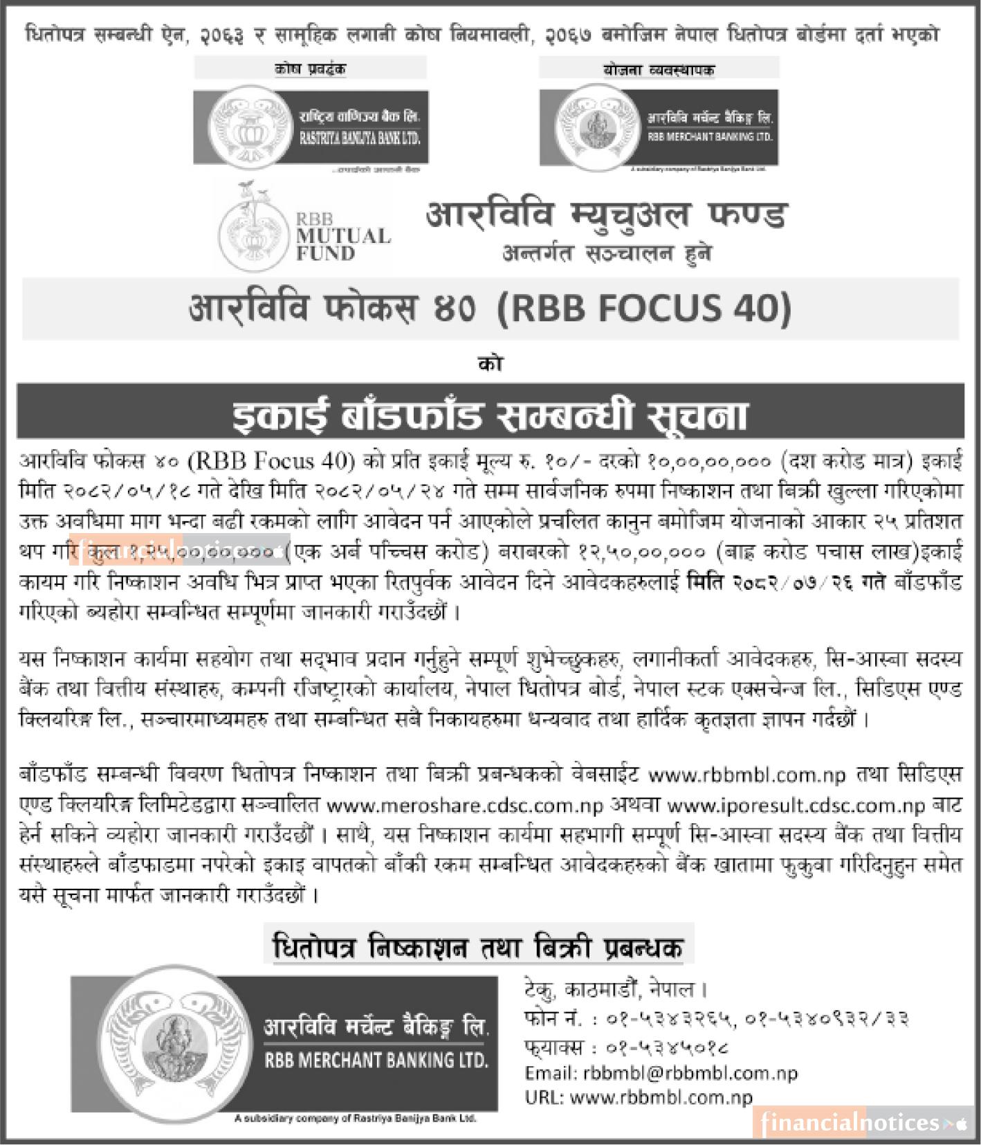 आरबीबी फोकस ४० (RBB Focus 40) इकाई बाँडफण्ड सम्बन्धी सूचना